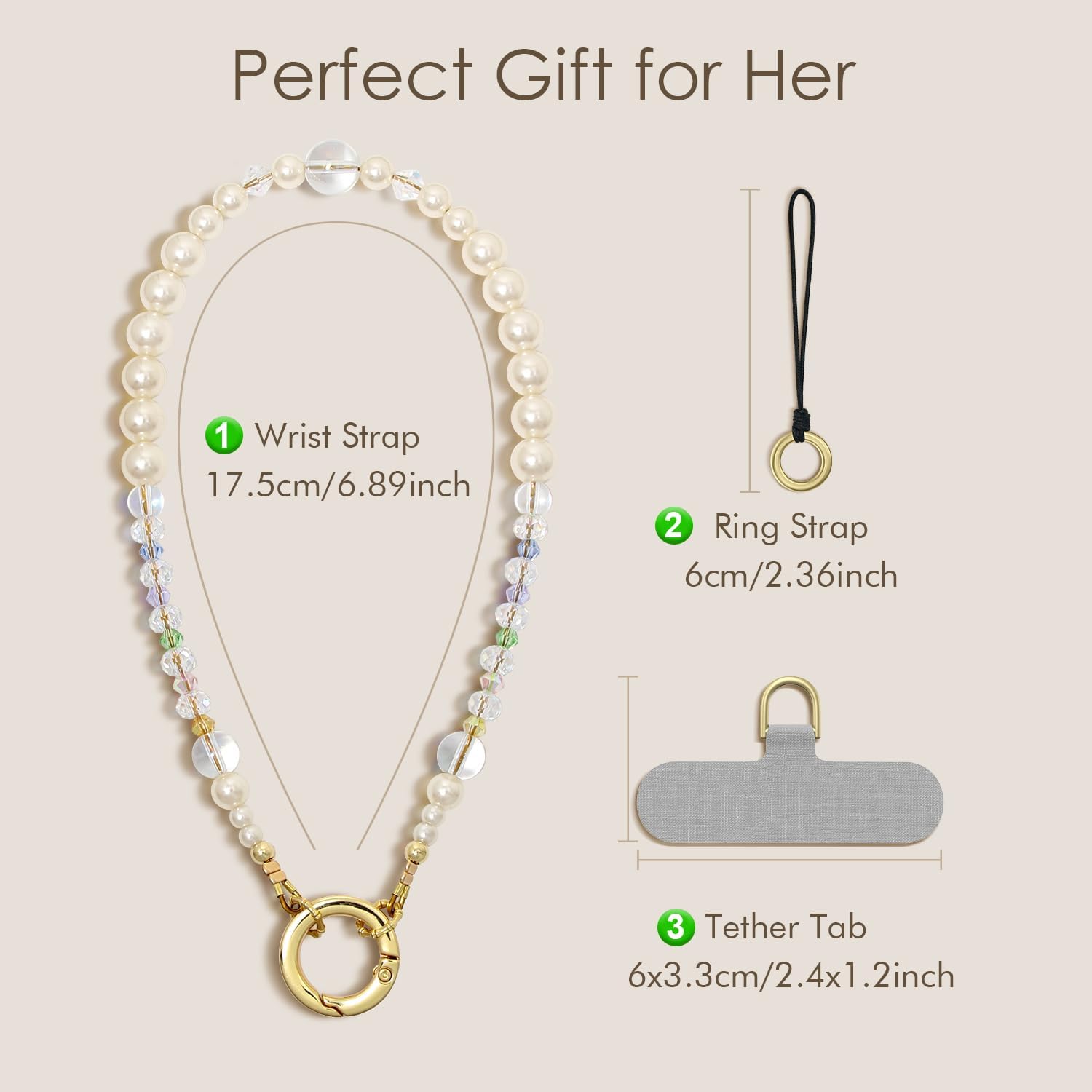 Our phone charm offers a stylish and secure way to carry your device, combining realistic imitation pearls, sparkling glass beads, and durable steel-wire construction to deliver a beautiful accessory that functions as an anti-lost wrist lanyard. Designed for versatile everyday use, it connects easily to phone cases, bags, wallets, keys, or ID holders, while the included ring strap and tether tab provide two installation options for a dependable and charging-friendly fit.