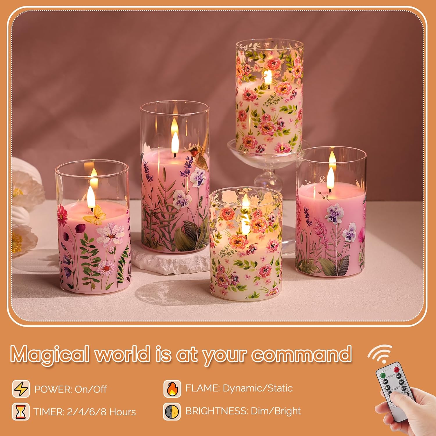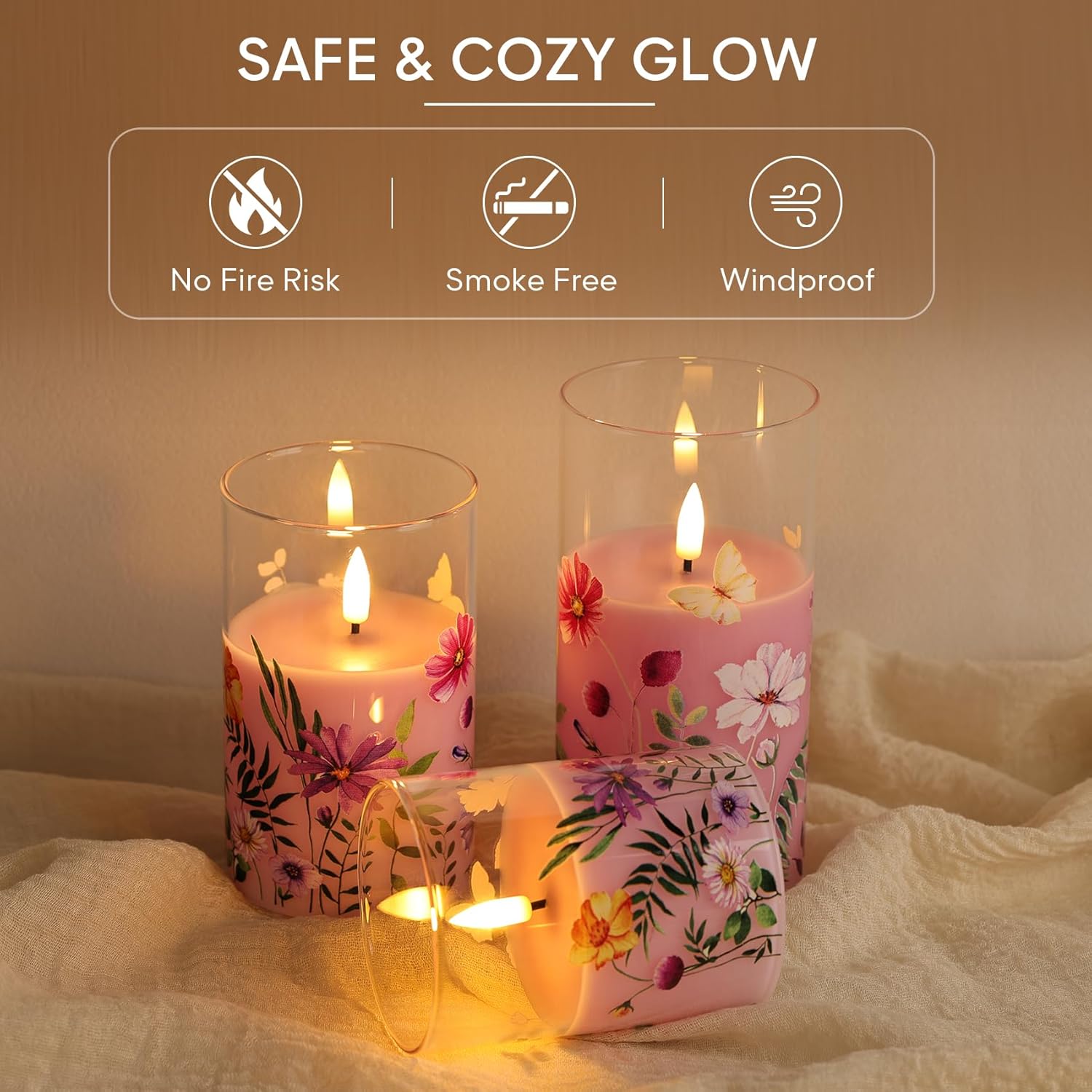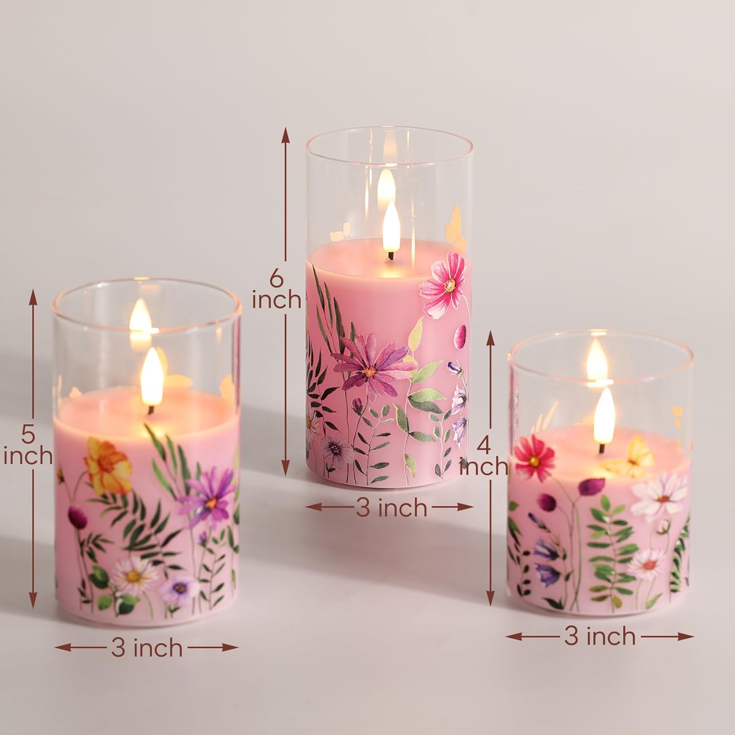 Pretty glass flameless candles featuring a beautiful pink floral design with real wax poured inside a clear glass jar. Designed with a realistic black wick and soft flickering LED flame, these pillar candles create a warm, relaxing, and cozy ambiance without the risks of real fire. Ideal for enhancing home décor, weddings, romantic dinners, and special occasions, they offer elegance with complete safety.