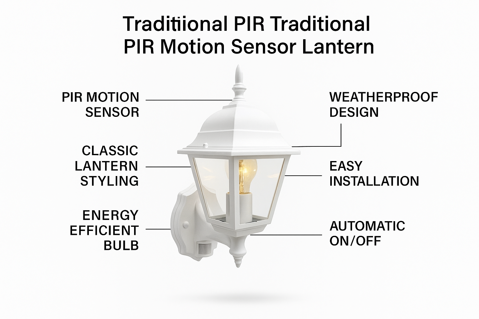 Our Outdoor PIR Wall Lantern Sensor Light delivers reliable motion-activated lighting with a classic 4-sided lantern design, making it perfect for enhancing home security while complementing traditional or modern exteriors. This black lantern features a built-in PIR motion sensor that automatically turns on when movement is detected, offering added safety and style for entryways, patios, garages, or garden walls.