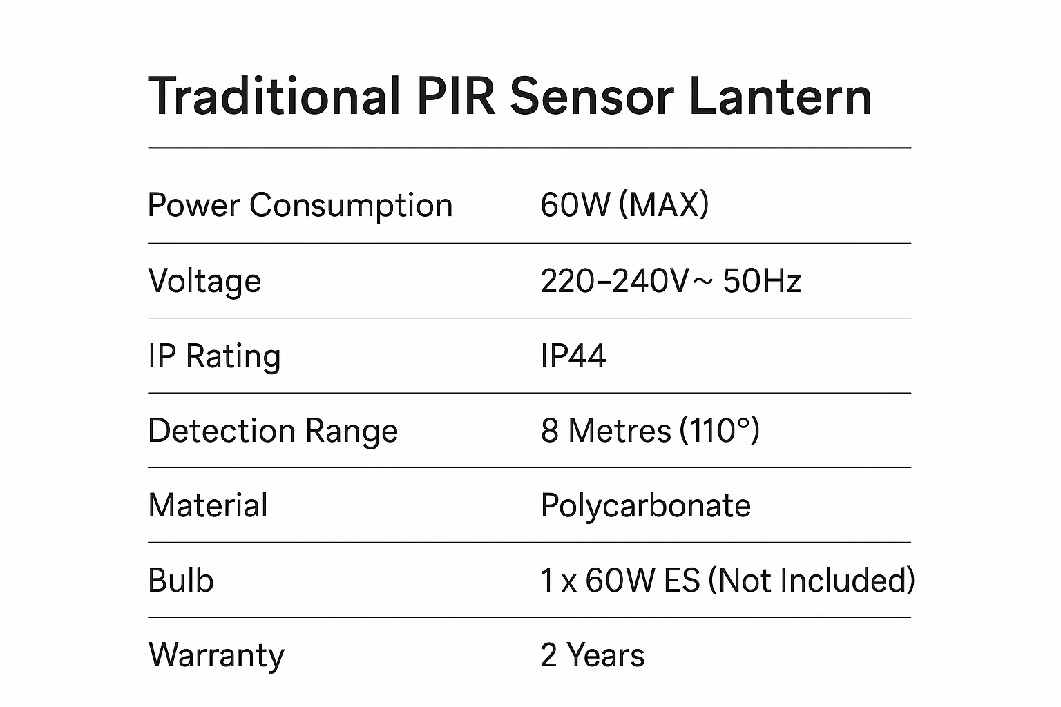 | Bulb Type | E27 (LED Compatible, not included) |