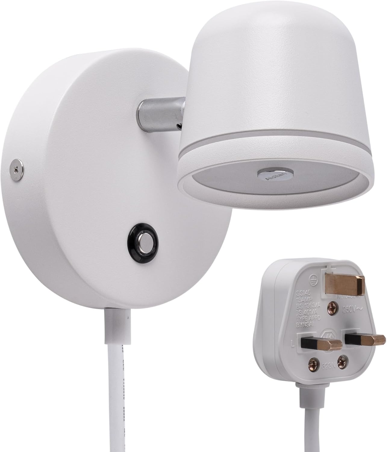 Plug-in White Wall Light – 3 Colour Temps Dimmable LED Wall Sconce with Touch Switch, Adjustable Spotlight for Bedroom & Living Room