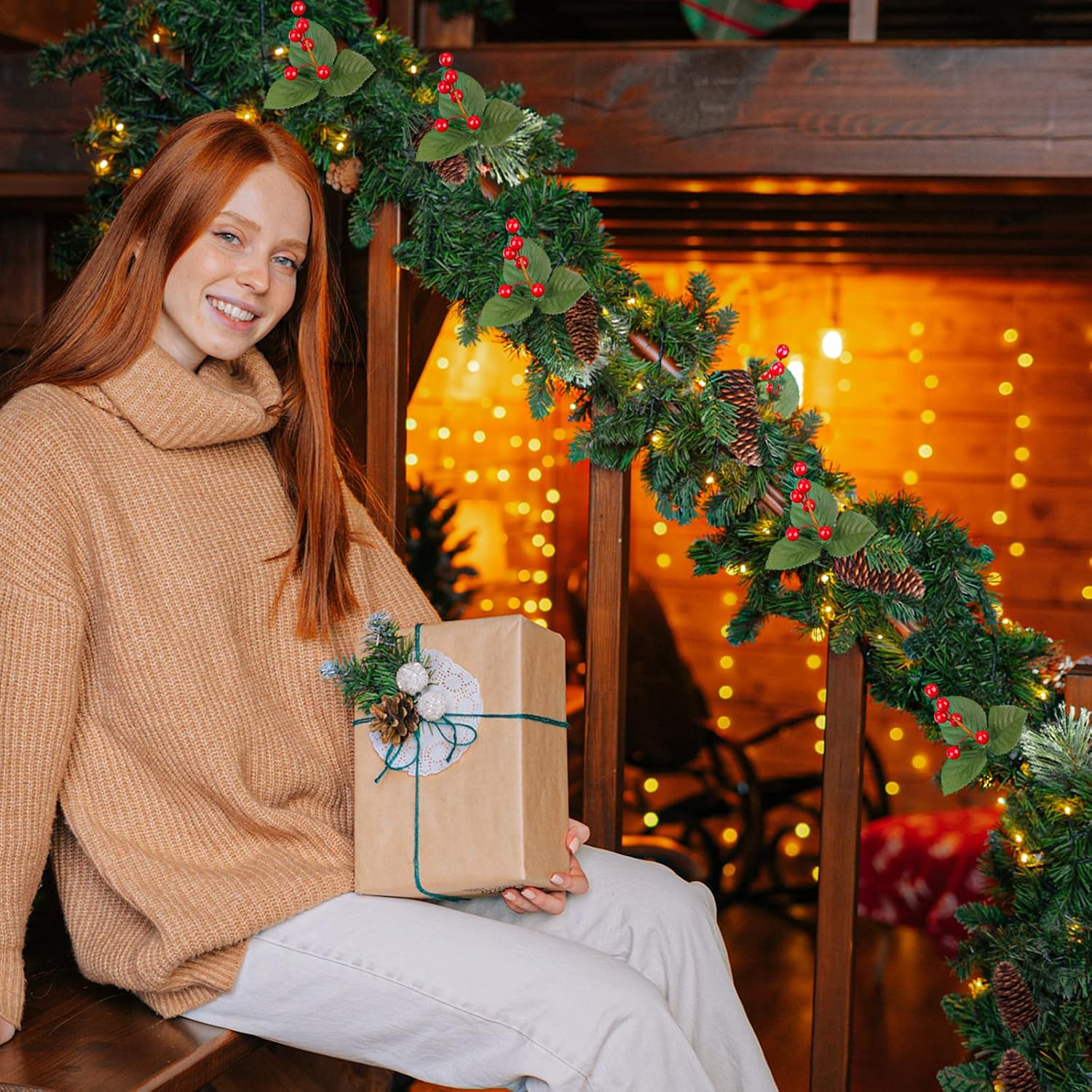 Our pre-lit 9ft artificial Christmas garland is designed to enhance holiday décor with warm white and multicolor lights, natural-looking foliage, and flexible shaping for windows, mantles, entryways, and other festive spaces. Featuring 200 branch tips, red berry clusters, pine cones, and a dual-mode lighting system operated from a convenient battery box, it delivers realistic seasonal charm with simple setup and reliable illumination.