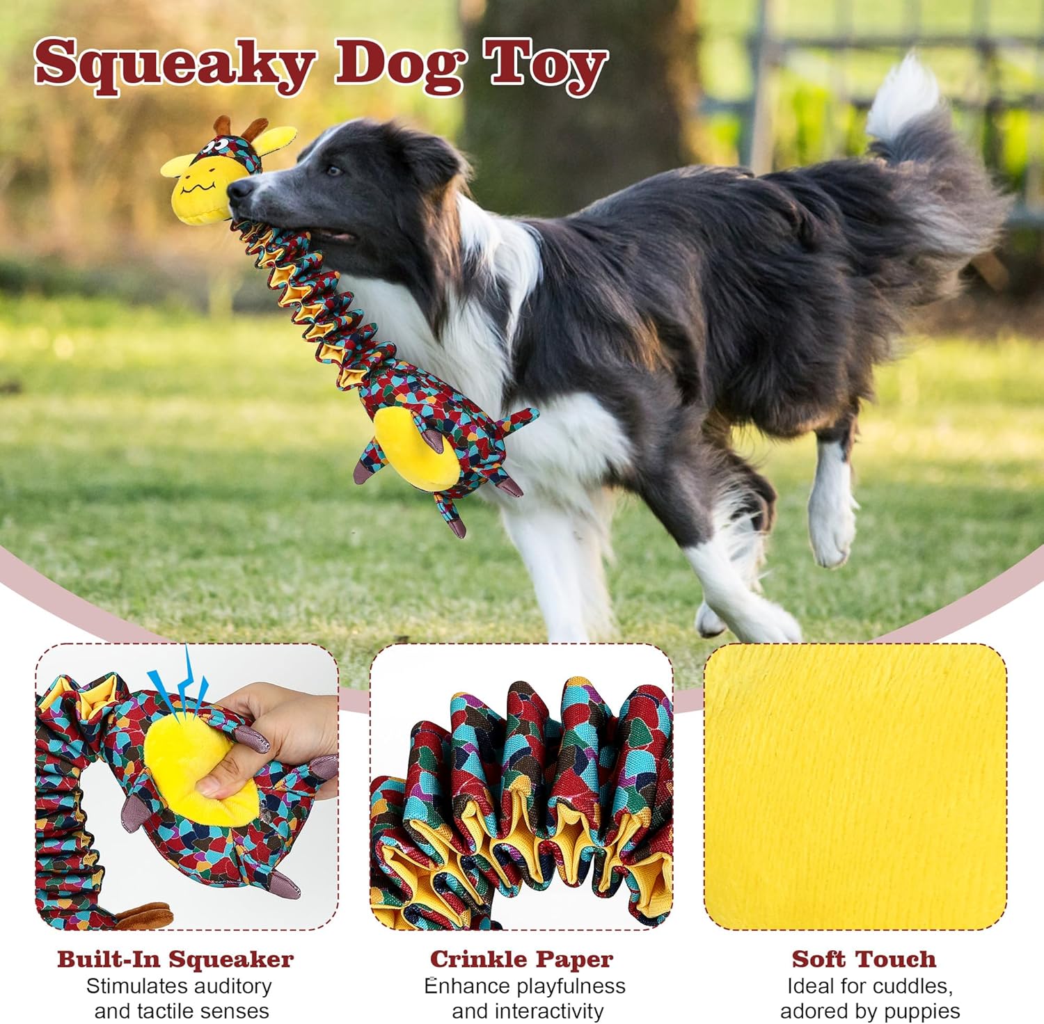 Our PUHOHUN giraffe-shaped squeaky dog toy provides hours of interactive play for small, medium, and large dogs, designed to alleviate boredom and promote mental stimulation. Featuring an elastic neck that extends up to 49cm, crinkle ears and tail, and a satisfying squeak, this durable toy encourages tug-of-war, fetch, and independent chewing. Crafted from a dual-layer fabric composite of thickened canvas and reinforced Oxford cloth, it withstands prolonged use while supporting dental health and relieving anxiety, making it an ideal gift for birthdays, holidays, or any special occasion.