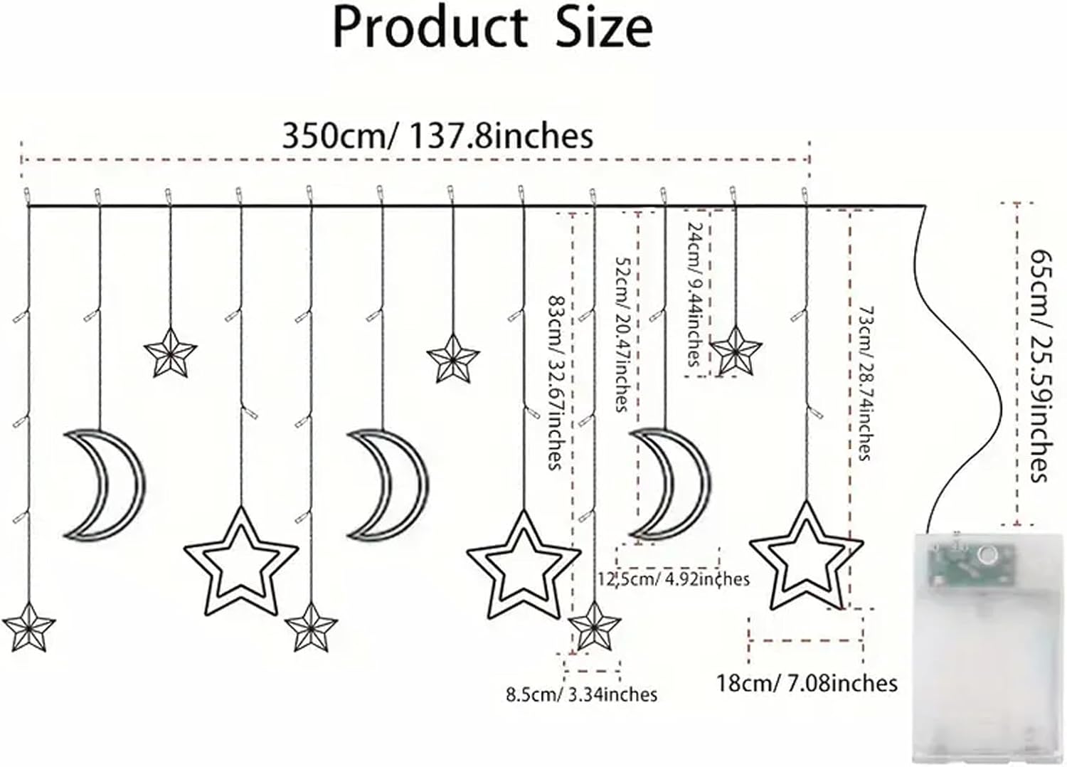 Create a magical and festive atmosphere in your home with these beautifully designed Ramadan star and moon curtain lights. Featuring 138 multicolor LEDs arranged in elegant star and moon patterns, this curtain light set is ideal for decorating windows, walls, curtains, and indoor spaces during Ramadan and Eid celebrations. The generous 3.5 x 1.1 meter size provides full coverage, transforming any room into a warm and inviting festive setting.