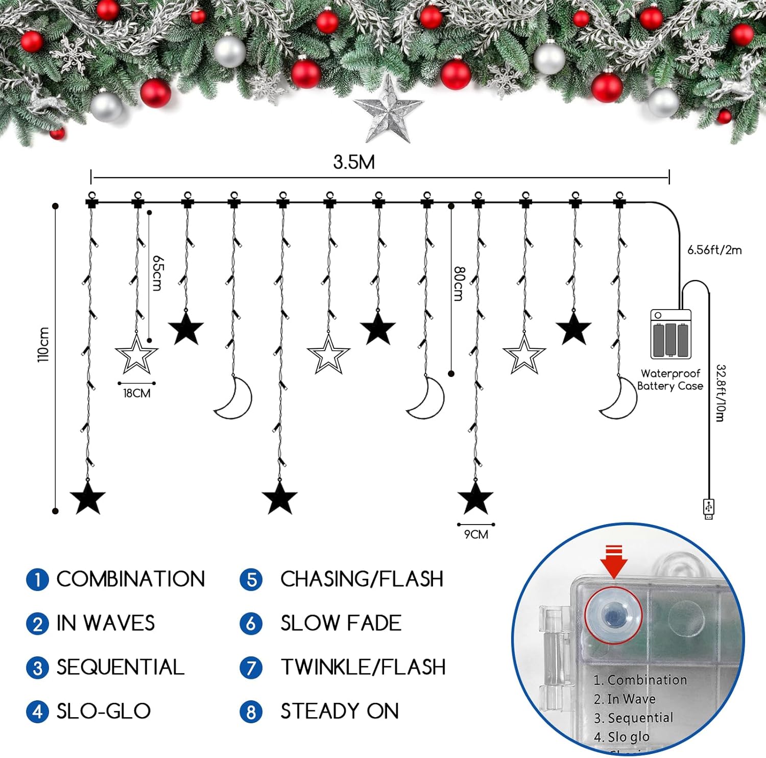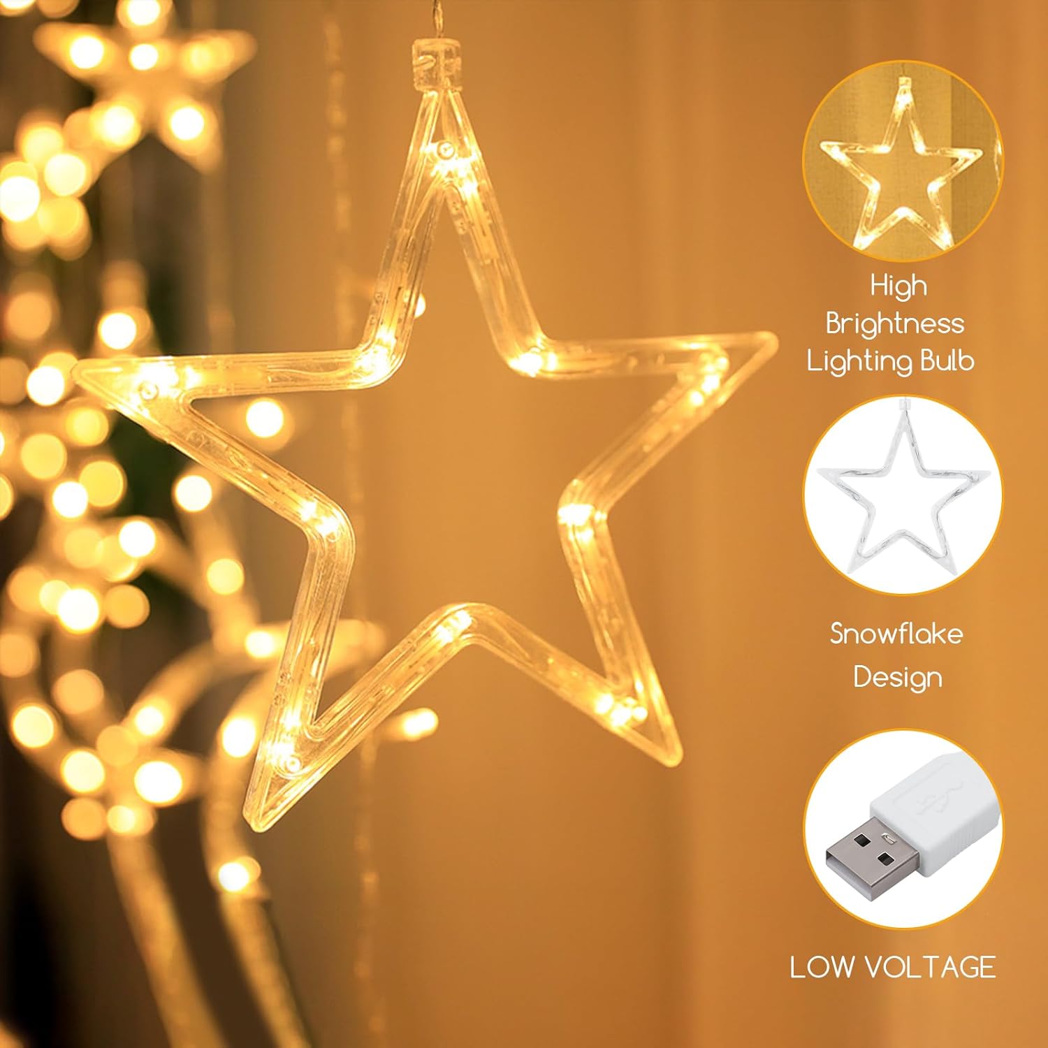 Add a magical and festive glow to your celebrations with these beautifully designed star and moon LED curtain lights. Featuring a traditional hanging curtain layout with large and small stars combined with moon shapes, these lights create a visually soothing and elegant display that enhances the spiritual and seasonal atmosphere of Ramadan, Christmas, weddings, and special events.