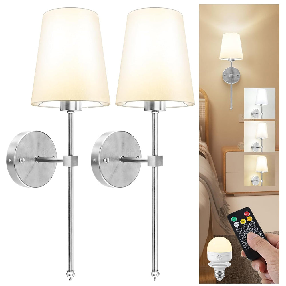 Our battery operated wall sconce set of 2 offers a modern, wire-free lighting solution with rechargeable E27 detachable bulbs and remote control operation, designed to provide flexible illumination for bedrooms, living rooms, hallways, and other indoor spaces. Featuring a powerful 5000mAh built-in battery, these wireless wall lights deliver up to 8–36 hours of continuous lighting per charge, with adjustable colour temperatures and dimming options to suit different moods and settings, all wrapped in a sleek silver metal finish with a soft fabric shade for an elegant and comfortable ambience.