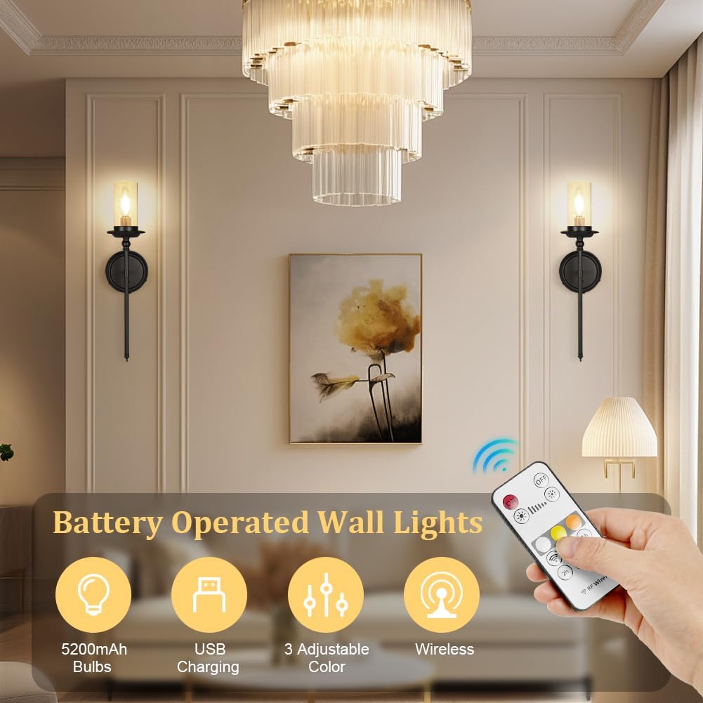 Our rechargeable battery operated wall sconce set of 2 delivers flexible indoor lighting with a sleek metal body and elegant glass shade, designed to enhance bedrooms, living rooms, hallways, and other interior spaces. Featuring detachable rechargeable bulbs with touch and remote control operation, these wireless wall lights offer three selectable colour temperatures and smooth dimming to suit different moods and tasks. The cordless design removes the need for wiring, allows easy wall mounting, and enables the lights to be detached and used during power outages for added convenience and safety.