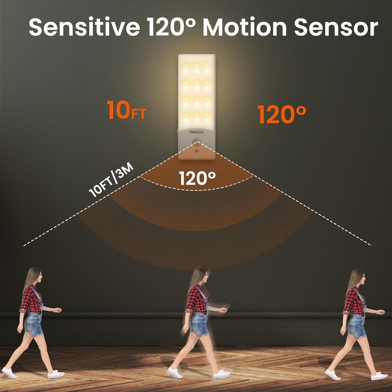 Two TNMOO motion sensor lights with a USB cable on a white background
