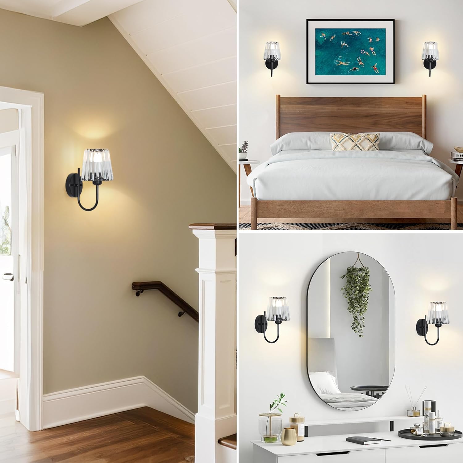 Our rechargeable wall lights set of two is designed to deliver elegant, cordless indoor lighting for living rooms, bedrooms, bathrooms, and hallways, combining a modern black metal frame with a clear K9 crystal glass shade for a refined decorative effect. Powered by removable USB rechargeable LED bulbs with up to 25 hours of runtime, these battery operated wall sconces offer flexible brightness control, selectable colour temperatures, and convenient remote operation, making them a practical and stylish wireless lighting solution for everyday home use.