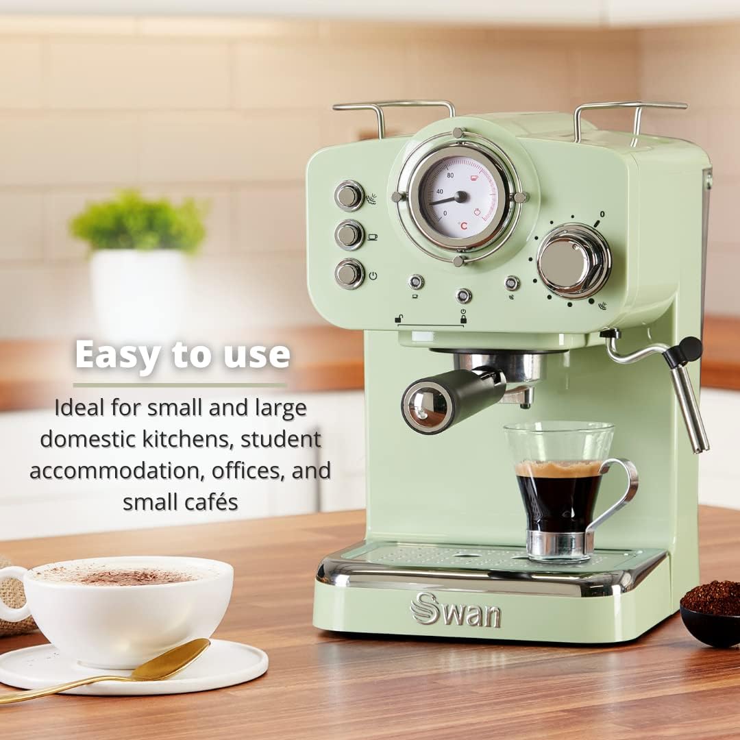 Brew café-quality coffee at home with the Retro Espresso Coffee Machine in Retro Green, combining timeless design with professional-grade performance. Equipped with a powerful 15-bar pressure pump and an 1100W heating system, this machine extracts rich, aromatic espresso every time. The self-priming system ensures it’s always ready to use, while the 1.2L detachable water tank makes refilling and cleaning effortless. Perfect for ESE pods or ground coffee, it offers flexibility for all coffee lovers.