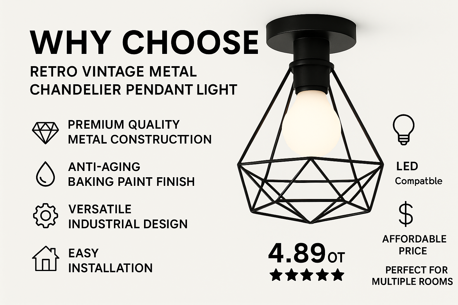 Retro Vintage Metal Chandelier Pendant Light – Warm White Flush Ceiling Fixture