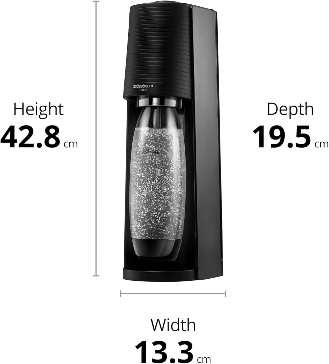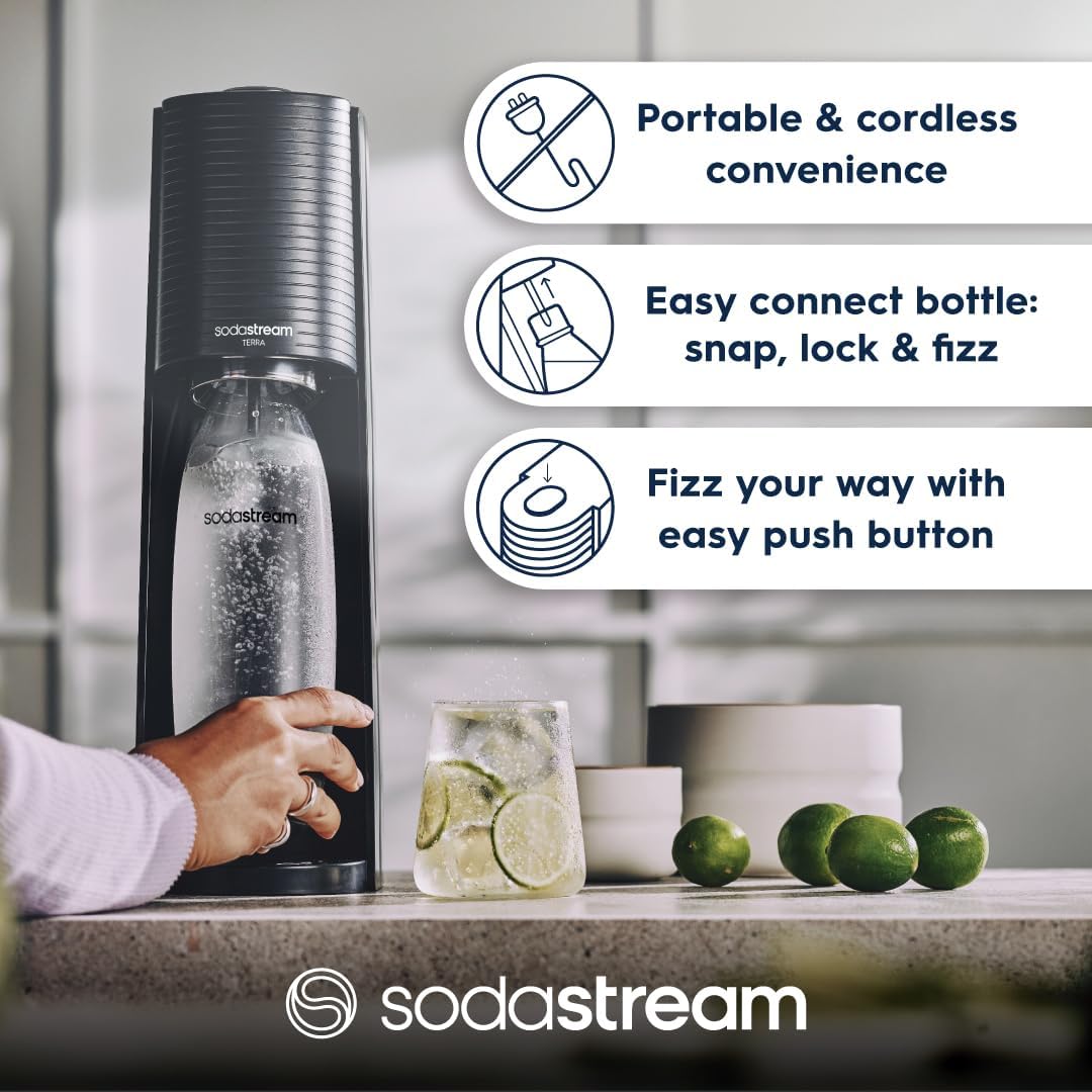 Our SodaStream Terra Sparkling Water Maker transforms everyday tap water into fresh, fizzy drinks in just seconds. Featuring an innovative Quick Connect CO2 system, this eco-friendly sparkling water machine lets you enjoy carbonated beverages at home—while cutting down on single-use plastic bottles. Its sleek, modern black design fits seamlessly into any kitchen, making hydration simple, stylish, and sustainable. Perfect for creating your favourite soft drinks or experimenting with unique flavour blends, this sparkling water maker is ideal for daily use, entertaining guests, or making mealtimes more refreshing.