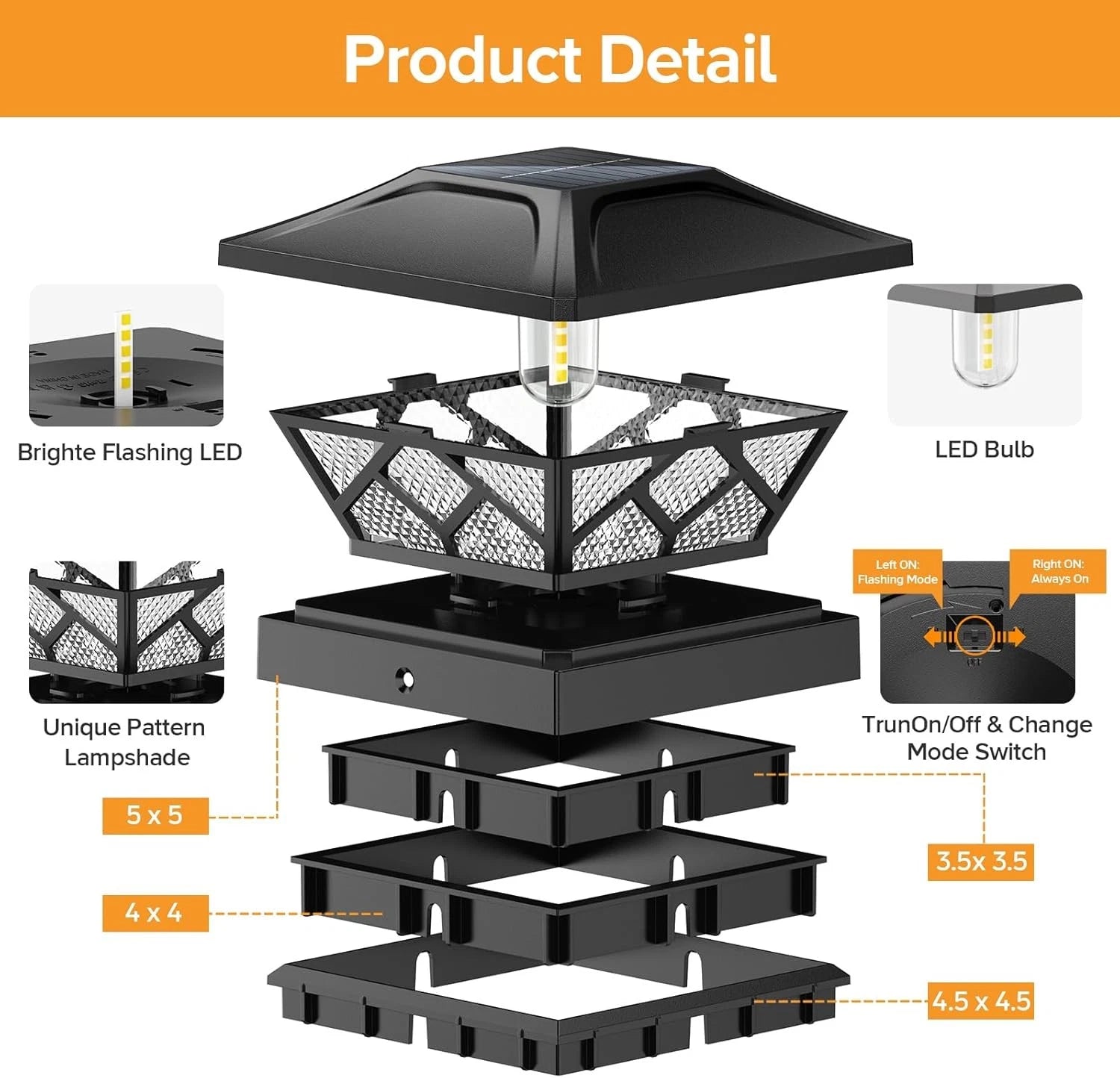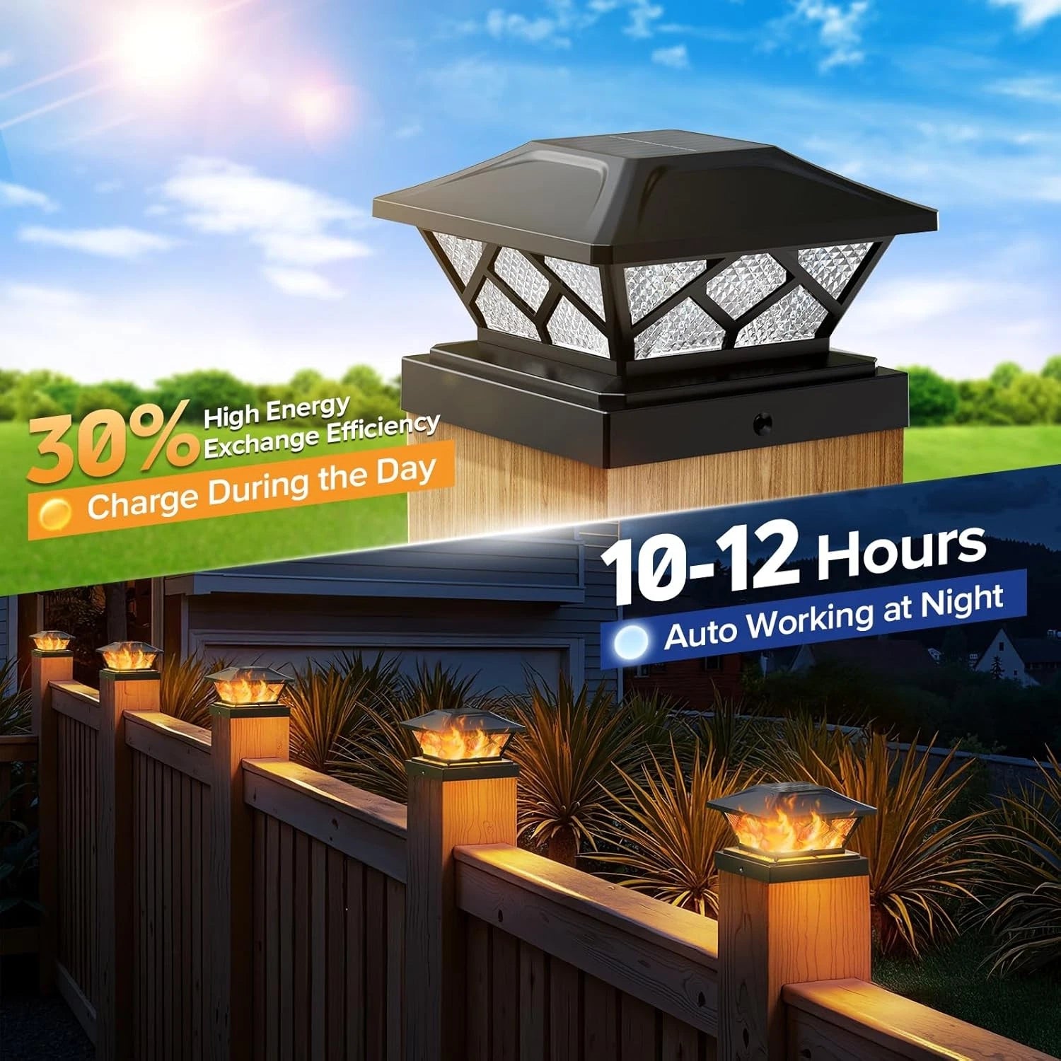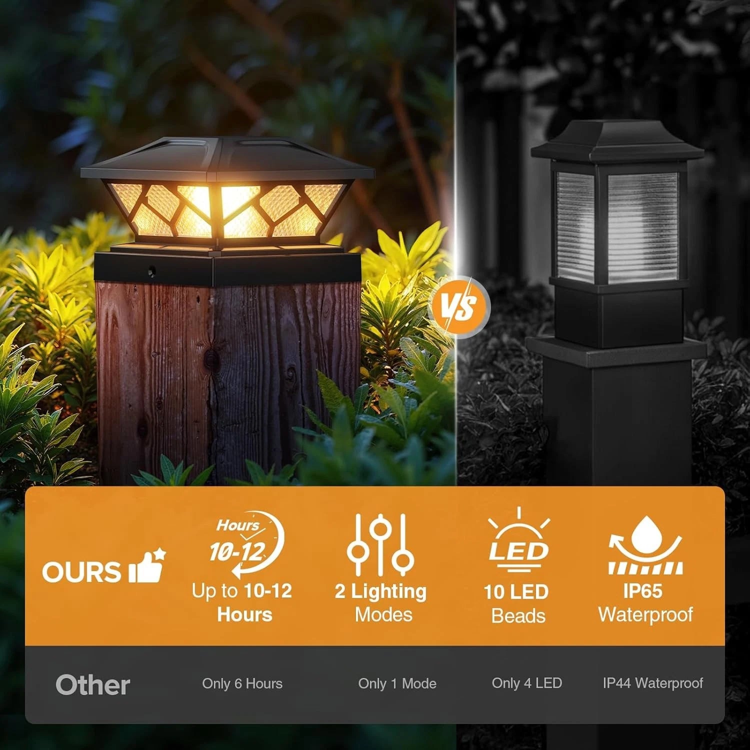 Illuminate your garden, patio, or deck with the stylish Solar Deck Post Cap Lights in sleek black finish. Designed for both beauty and function, these lights feature two lighting modes — flickering flame and constant glow, creating the perfect ambiance for any outdoor setting. Built with durable Acrylonitrile Butadiene Styrene (ABS) material and rated IP65 waterproof, these solar lights are made to withstand rain, snow, and harsh weather.