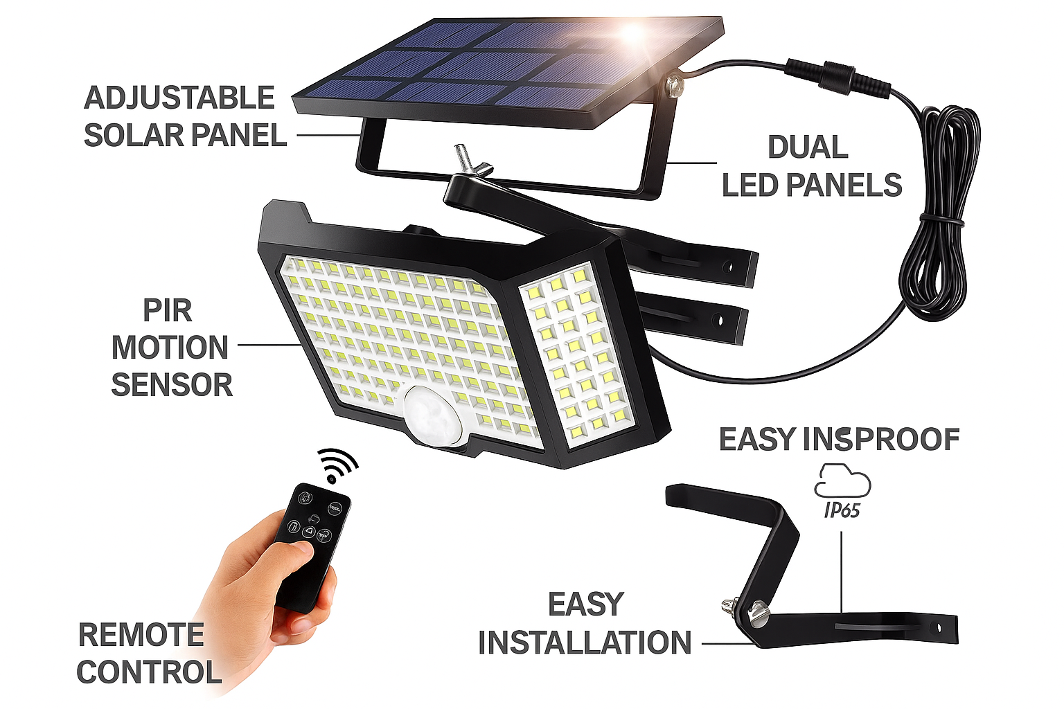 Solar Power LED Light, designed for energy-efficient illumination and added security. This wall-mounted lamp features a PIR motion sensor, ensuring the light activates when movement is detected. Ideal for gardens, driveways, patios, and pathways, it offers reliable lighting powered entirely by solar energy, eliminating the need for wiring or electricity.