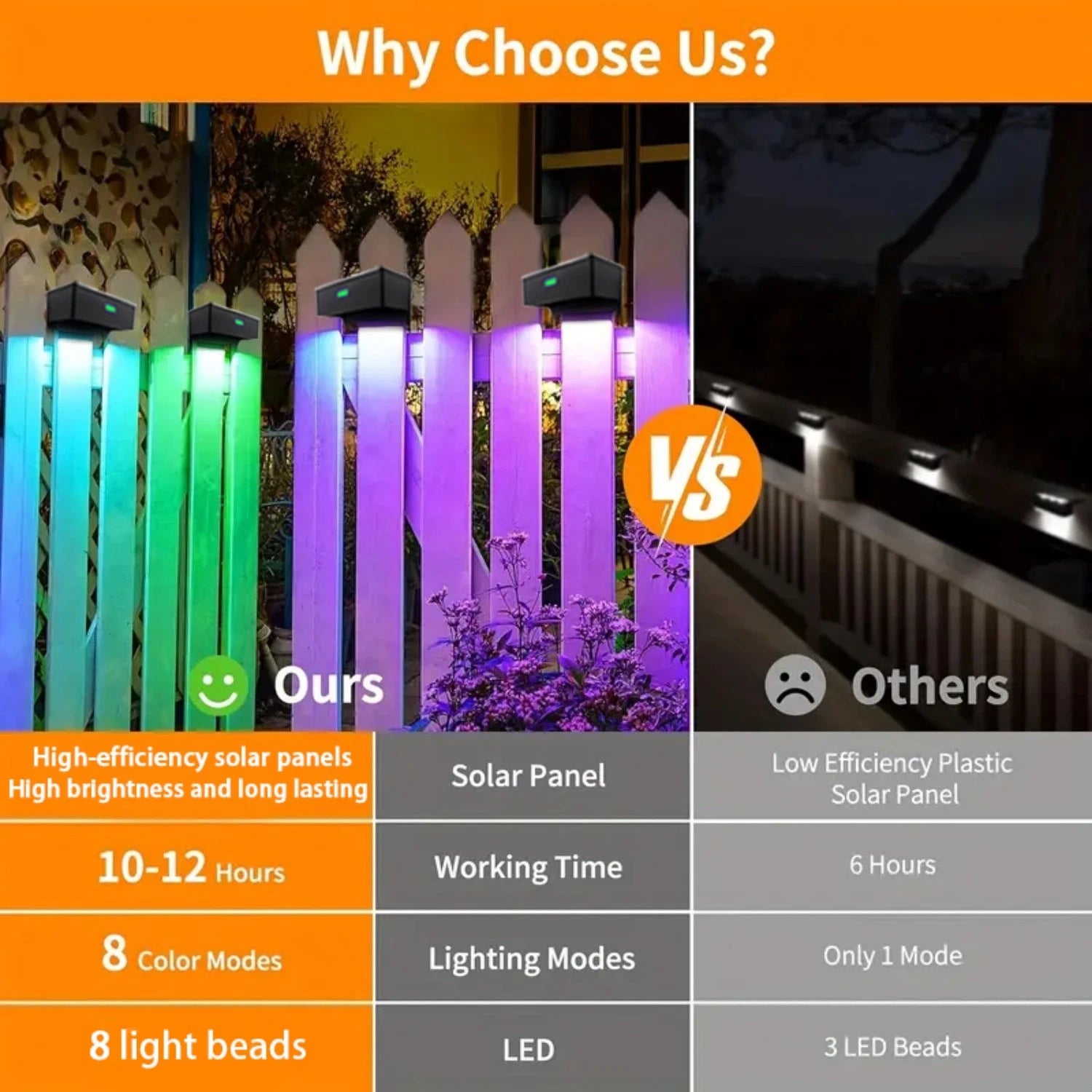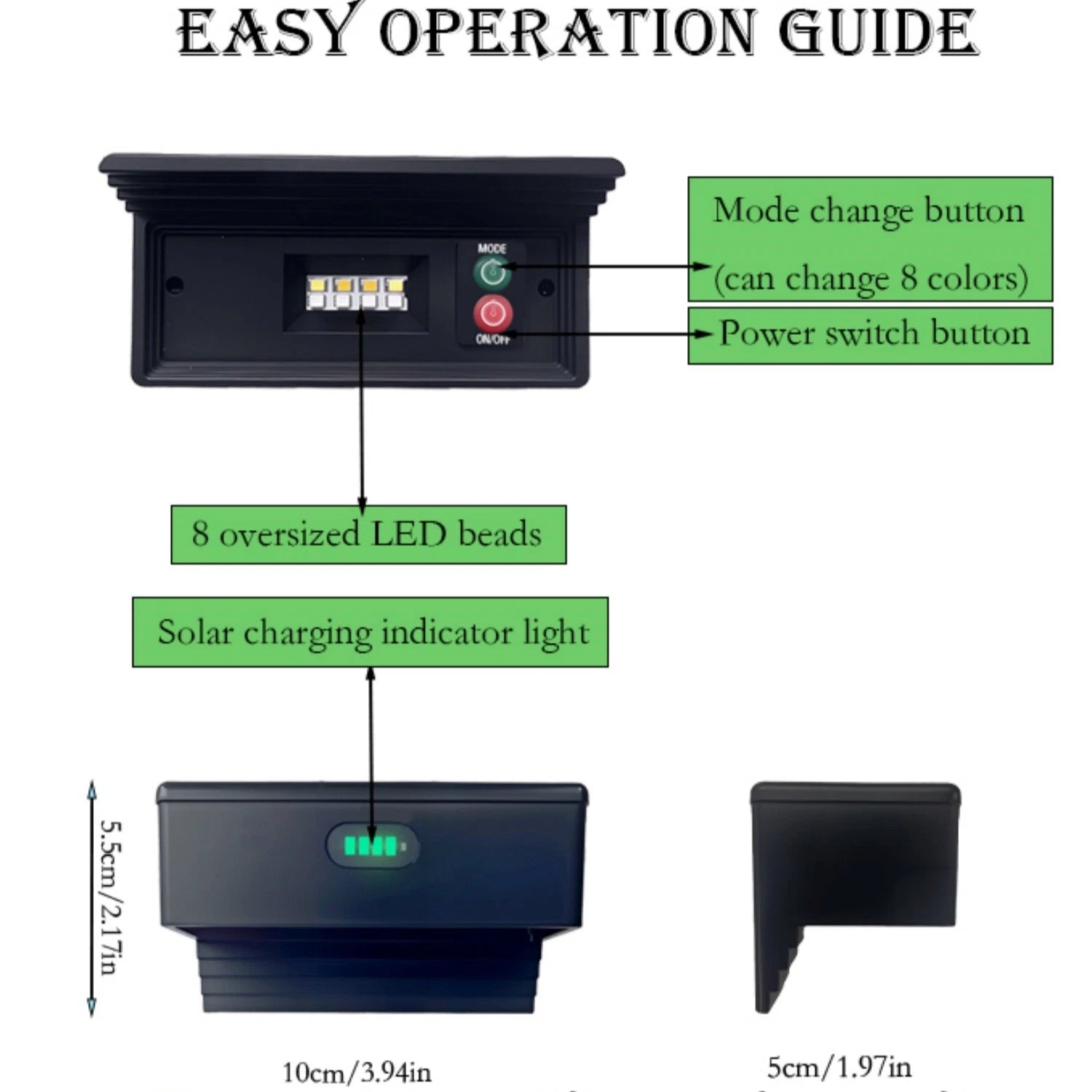 Illuminate your outdoor spaces effortlessly with these Solar Powered Door Fence Wall Lights, designed for durability, elegance, and energy efficiency. Crafted from high-quality ABS and PVC materials, these IP65 waterproof LED lights withstand harsh weather conditions, ensuring reliable lighting year-round. With eight dynamic lighting modes and multiple color options — warm, white, and multicolor — these lights add a captivating glow to your garden, patio, stairs, or fence.