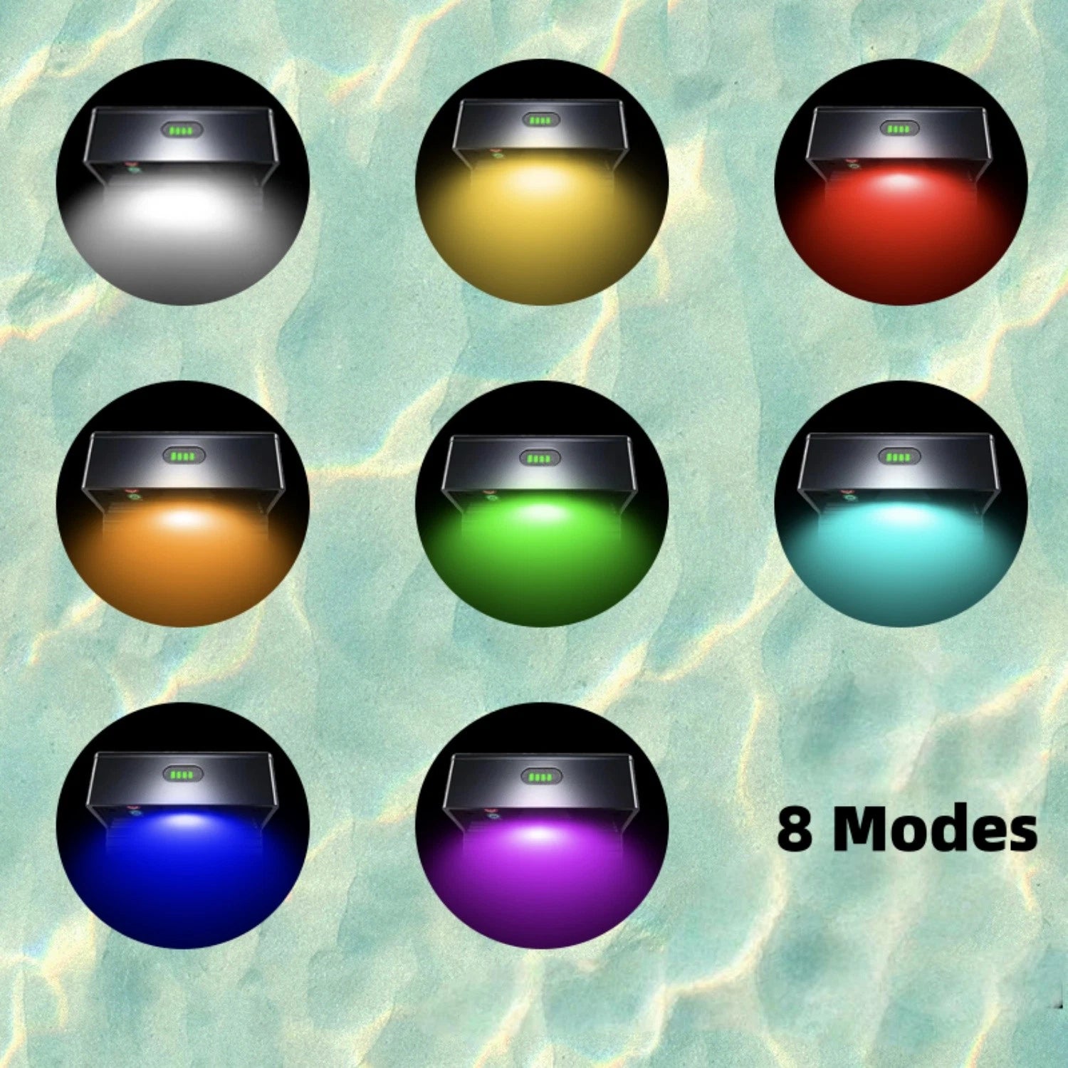 8 lighting modes with adjustable brightness and color (Warm/White/Multicolor).