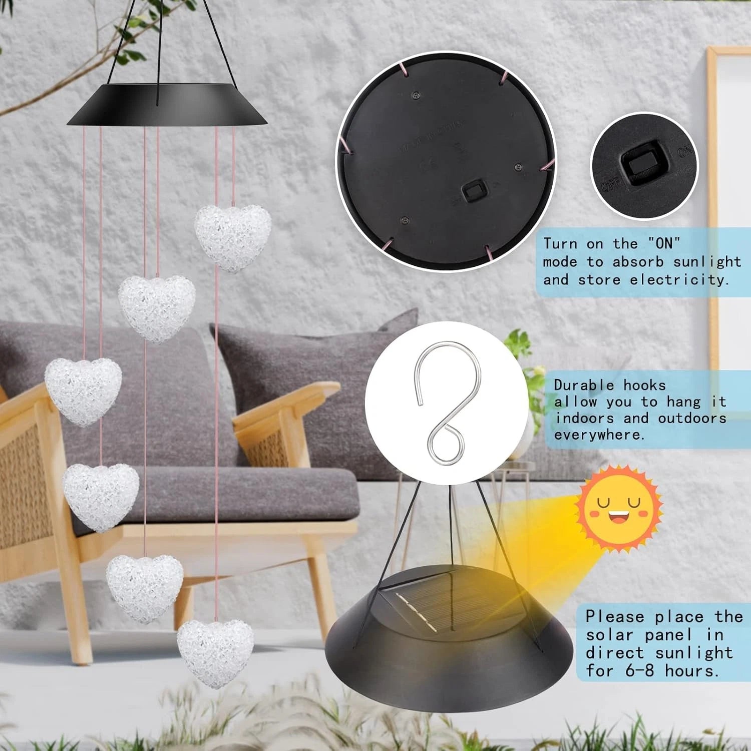 1 × Solar Powered Heart LED Colour Changing Wind Chime