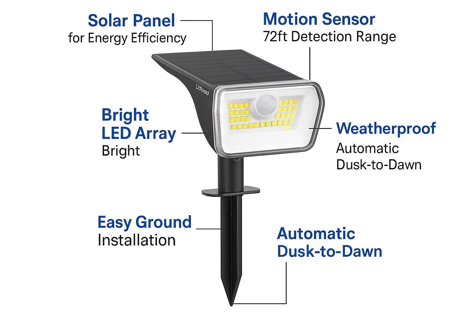 No wiring or electricity needed—charges via sunlight during the day and operates at night.