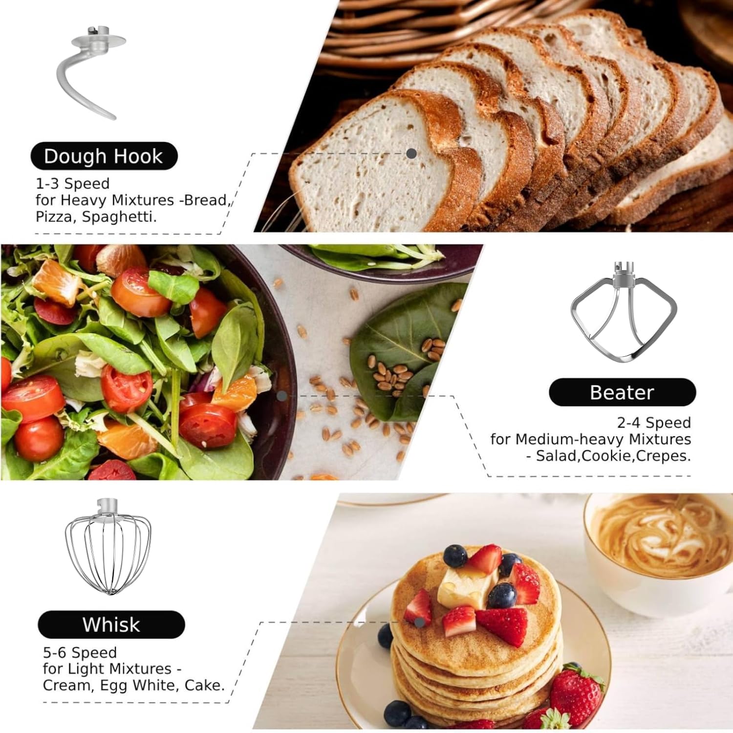 Three mixing attachments (whisk, dough hook, beater) for various baking needs