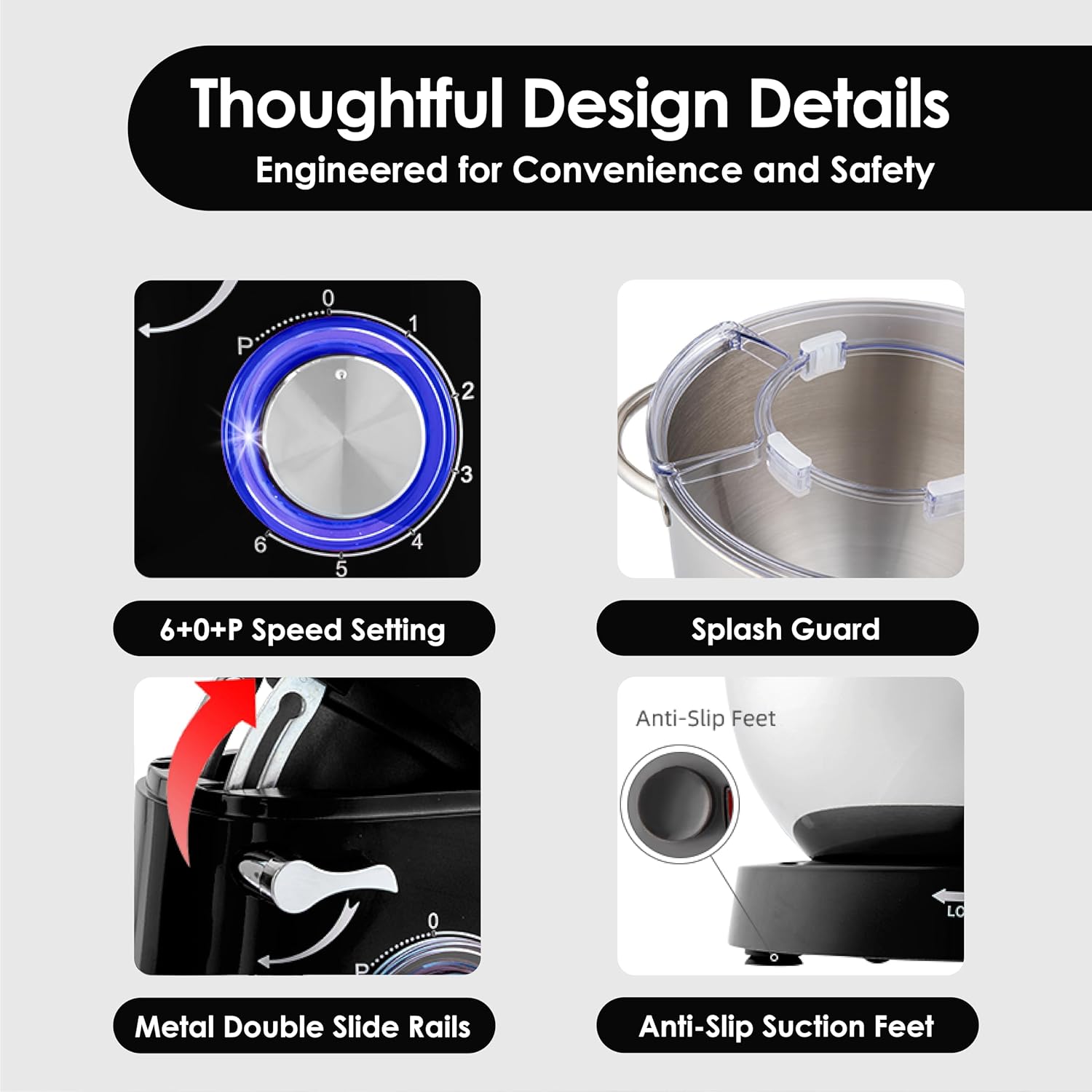 Special Features | 1400W high performance pure copper motor, 6.2L larger stainless steel bowl with two handles, 6+0 speeds rotary knob with pulse function, Full metal gears + ball bearing + belt structure, Blue LED light as power indicator. Low noise level ≤75dB, Vibration absorption design, no displacement during operation, 4 strong suction cups for more steady |