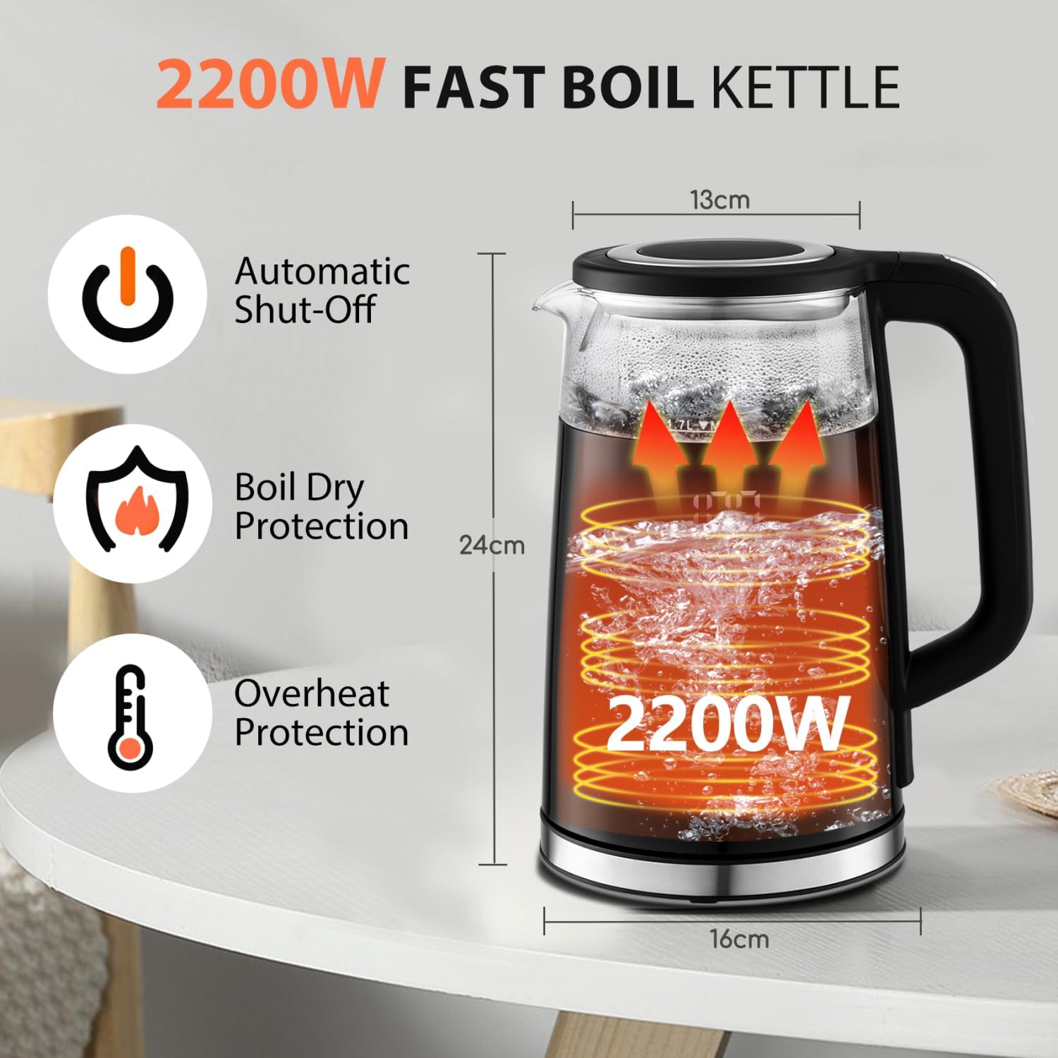 Fast 2200W Boiling: Heats 1.7L quickly, ideal for families.