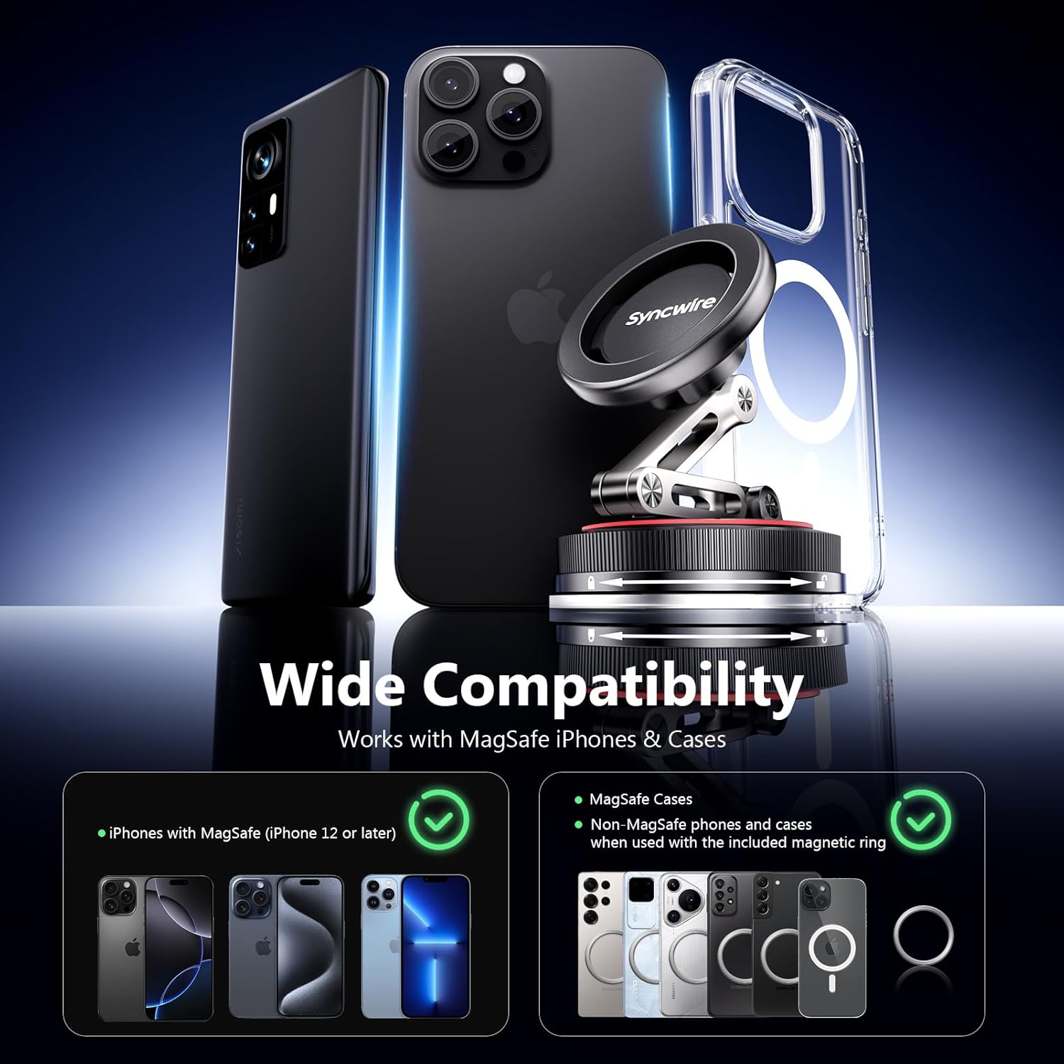 Experience superior magnetic stability and versatile adjustability with the SYNCWIRE MagSafe Car Mount [3-Axis Design], crafted for drivers who demand strength, precision, and style. Equipped with 18 N52 dual magnetic rings, it delivers unmatched holding power to keep your phone firmly in place, even on the roughest roads. This magnetic phone holder is compatible with MagSafe-enabled iPhones and other smartphones using the included magnetic alignment rings.