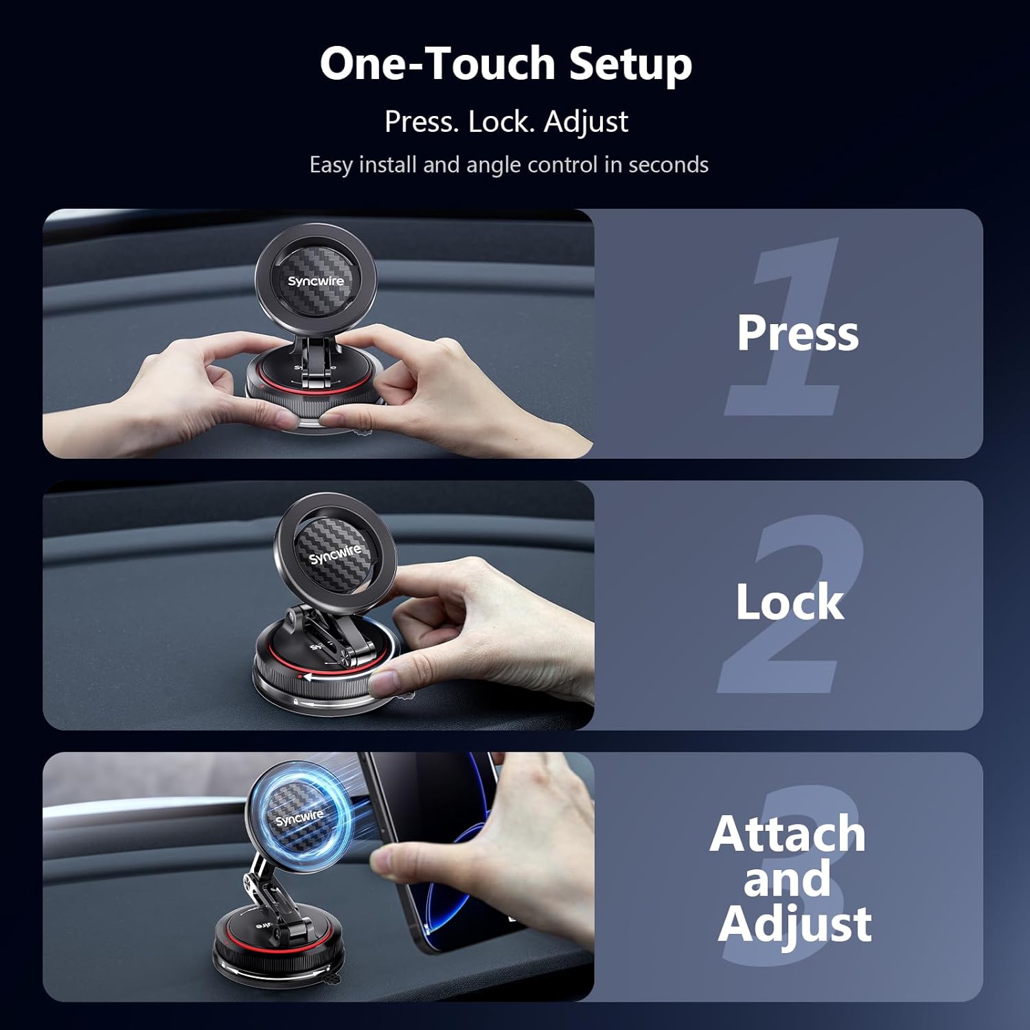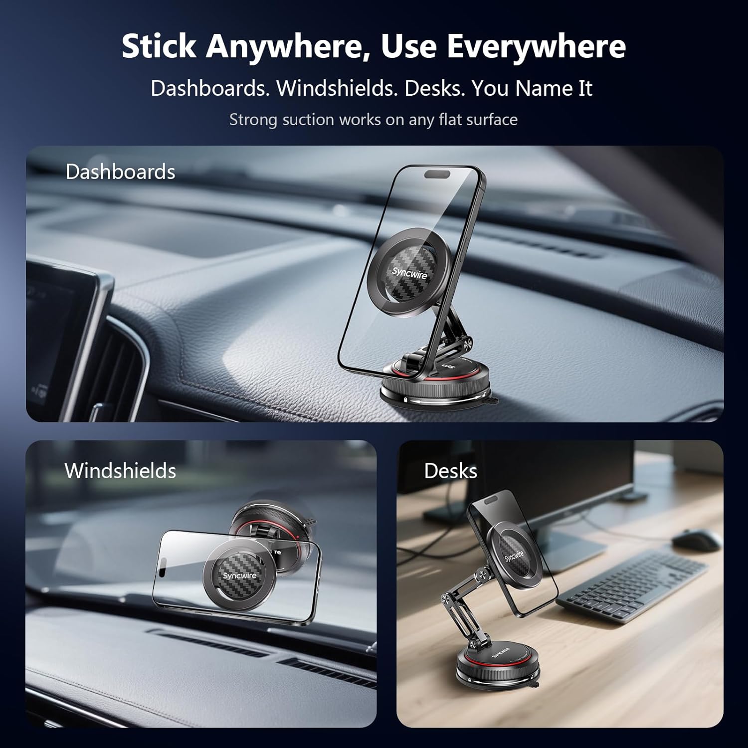 Our SYNCWIRE MagSafe Car Mount is engineered for superior magnetic strength, versatile positioning, and long-lasting stability. Featuring a 3-axis adjustable arm and 360° rotation, it allows complete control of your phone’s viewing angle for safe and convenient driving. Equipped with upgraded N52 dual-ring magnets, a heavy-duty suction cup, and nano adhesive gel, it ensures a secure hold on any surface—even on bumpy roads. Compatible with iPhone 12 and later MagSafe models, as well as non-MagSafe phones using the included magnetic rings, this mount delivers strength, style, and performance in one compact design.