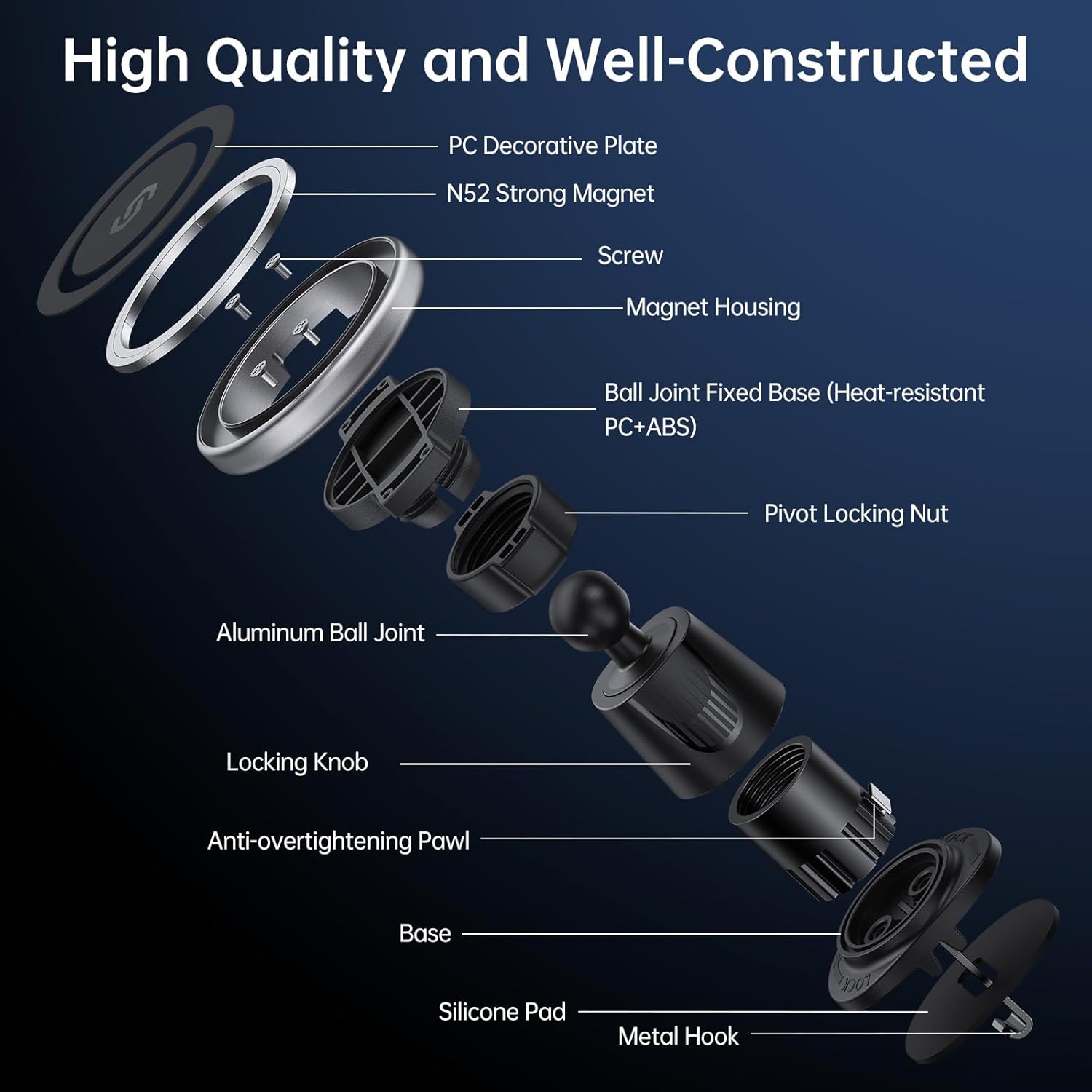 The build quality of this SYNCWIRE MagSafe mount is excellent. The combination of metal and heat-resistant plastic makes it durable and stylish. The mount holds my phone securely even on rough roads, and removing it is easy but not too loose, so there’s no risk of it falling. The anti-overtightening feature is genius—it doesn’t damage my car vents. I’ve recommended this to friends and family, and they all love it too.