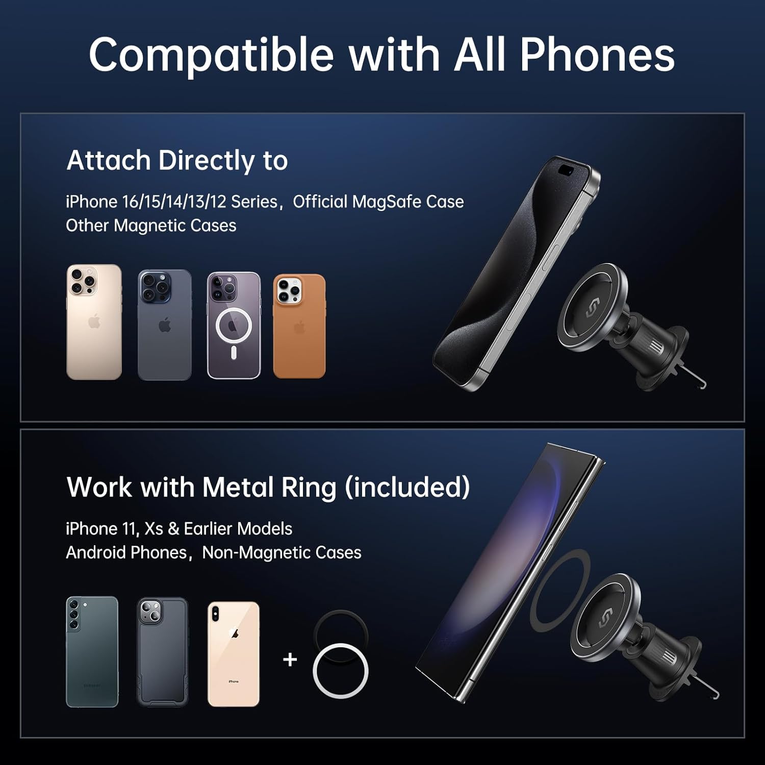 | Compatibility | iPhone 12-15 series, MagSafe cases, non-magnetic phones with metal rings |
