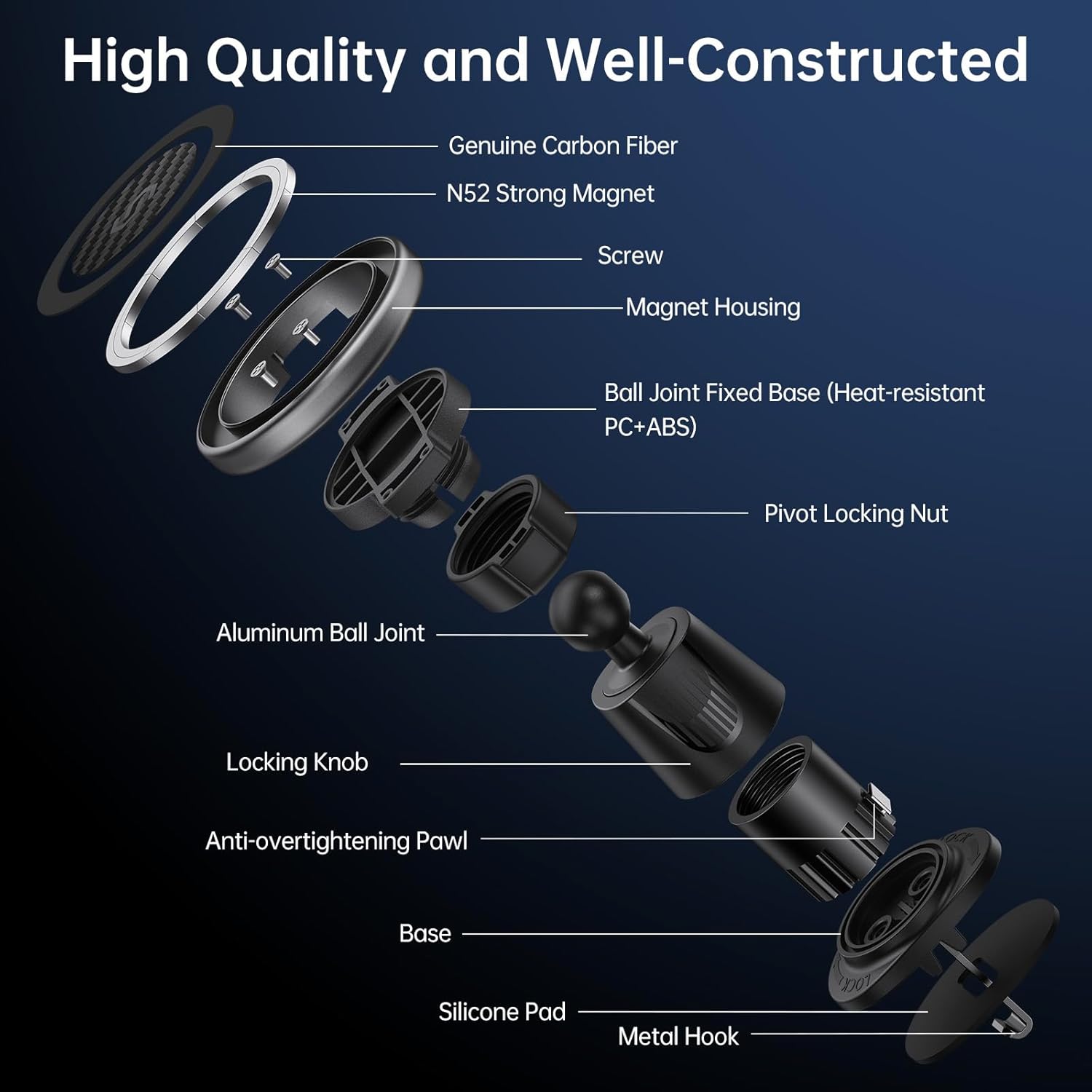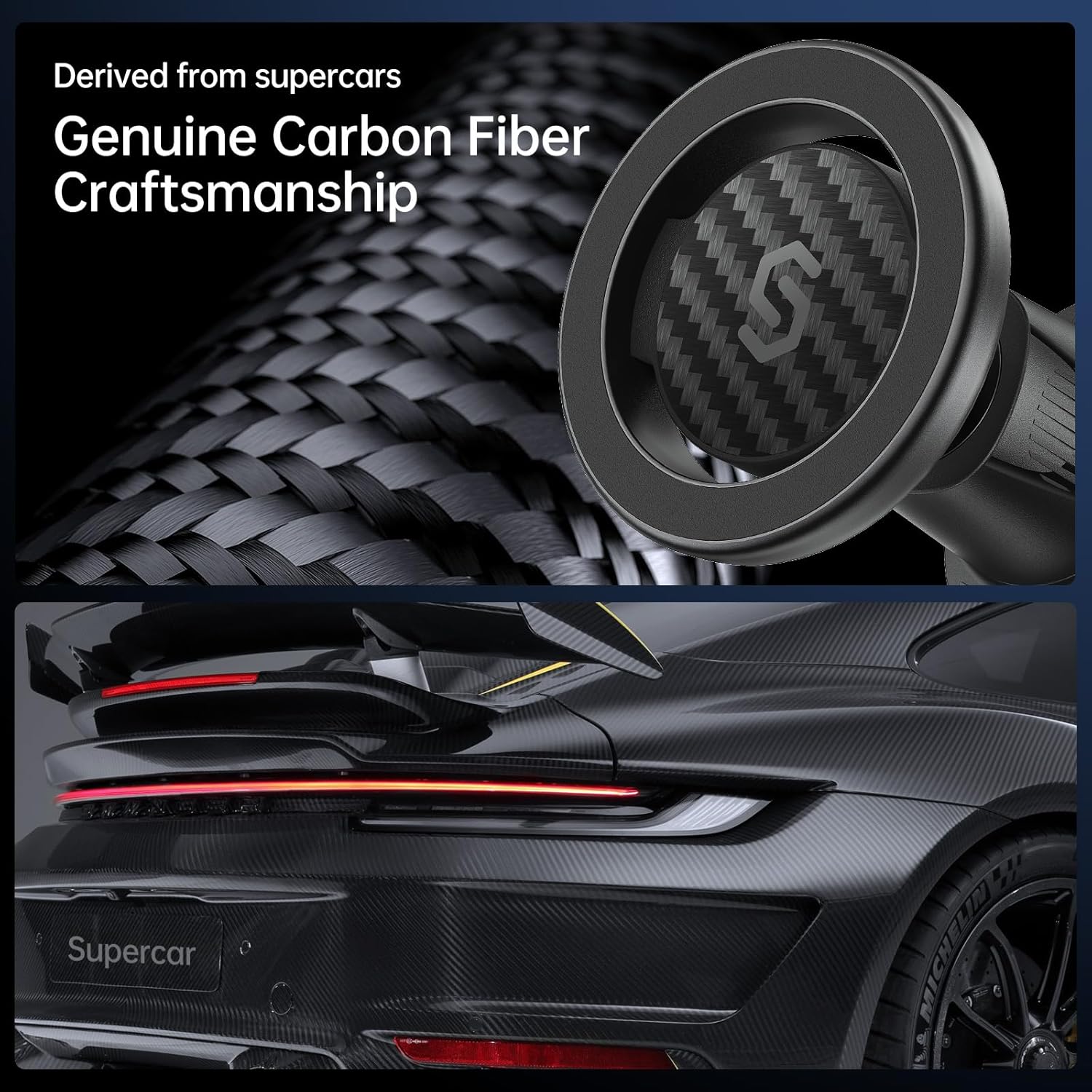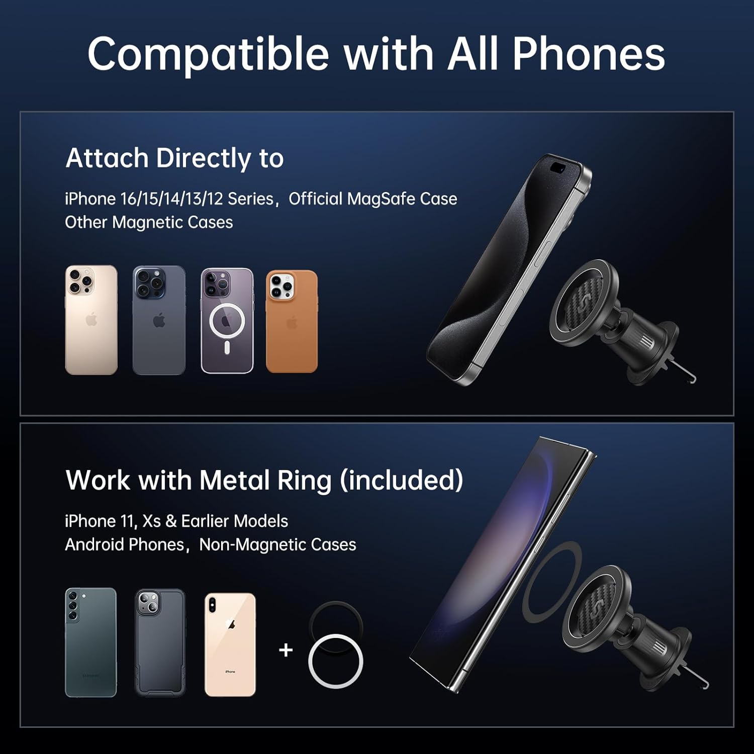 Our SYNCWIRE MagSafe Car Mount Vent is a premium magnetic phone holder engineered for seamless integration with MagSafe-compatible iPhones. Designed with a sturdy metal hook and durable heat-resistant plastic, it ensures a secure hold even on rough roads. The 16 N52-grade neodymium magnets provide optimal magnetic balance, keeping your device firmly in place. Its genuine carbon fiber finish adds a sleek, luxury touch while the 360-degree rotation allows flexible viewing angles for safer navigation and calls. With anti-overtightening design and wide vent compatibility, this mount enhances your driving experience with style and reliability.