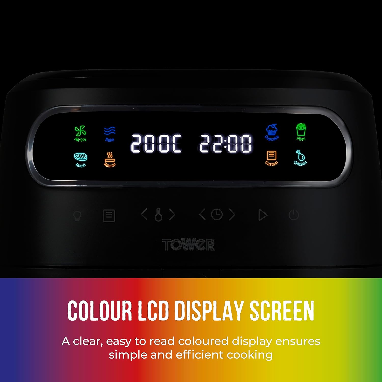 Colour LCD Display – Bright, easy-to-read colour screen with yellow, green, and blue highlights for simple navigation of presets and cooking options.