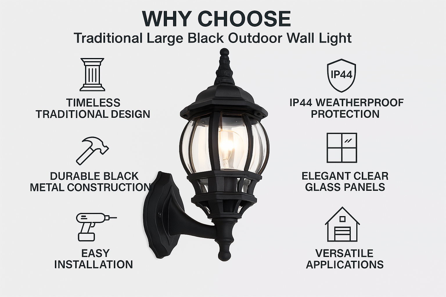 Our Traditional Large Black Outdoor Wall Light combines vintage-inspired design with modern energy efficiency, making it an ideal addition to UK gardens, porches, patios, and entrances. Constructed with durable IP44-rated materials to withstand the British weather, this outdoor wall lantern includes a 6W LED GLS bulb that offers bright, warm illumination while saving on energy. The elegant black finish and clear glass housing provide both form and function, enhancing any outdoor setting.