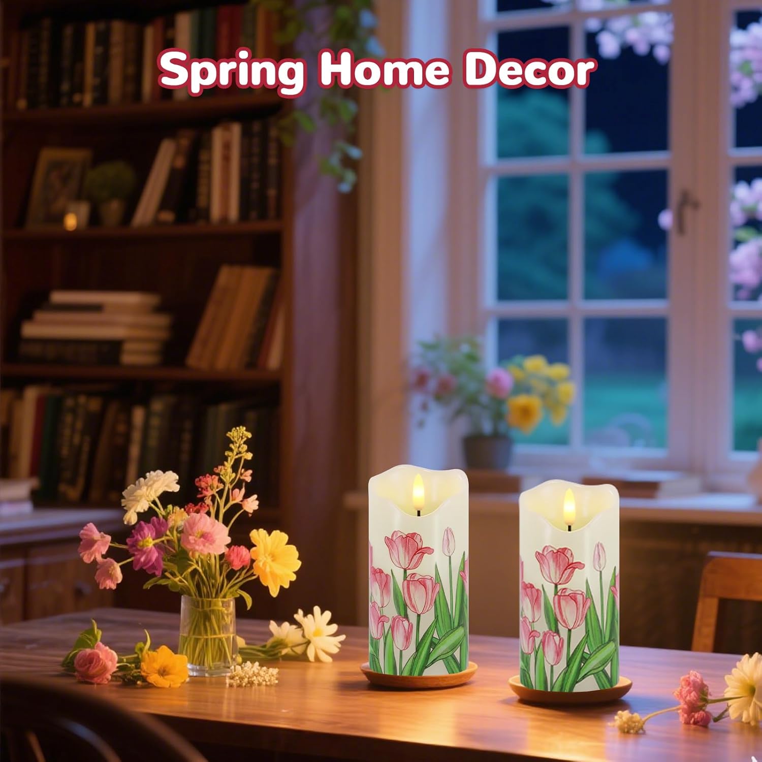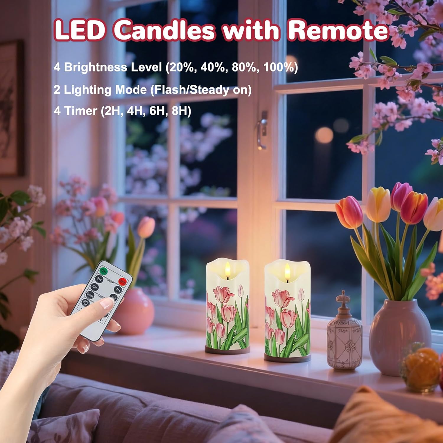 Bring a fresh and elegant touch to your space with these tulip-pattern flameless pillar candles, designed to enhance spring-inspired décor and romantic settings. Crafted from real wax with a delicate tulip and leaf motif, these candles offer a soft, natural appearance while delivering the warmth of candlelight without smoke, dripping wax, or fire risk.