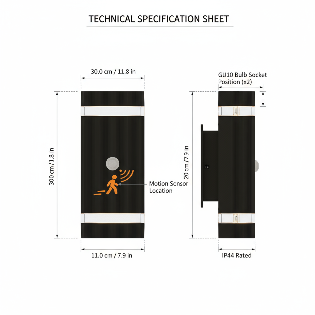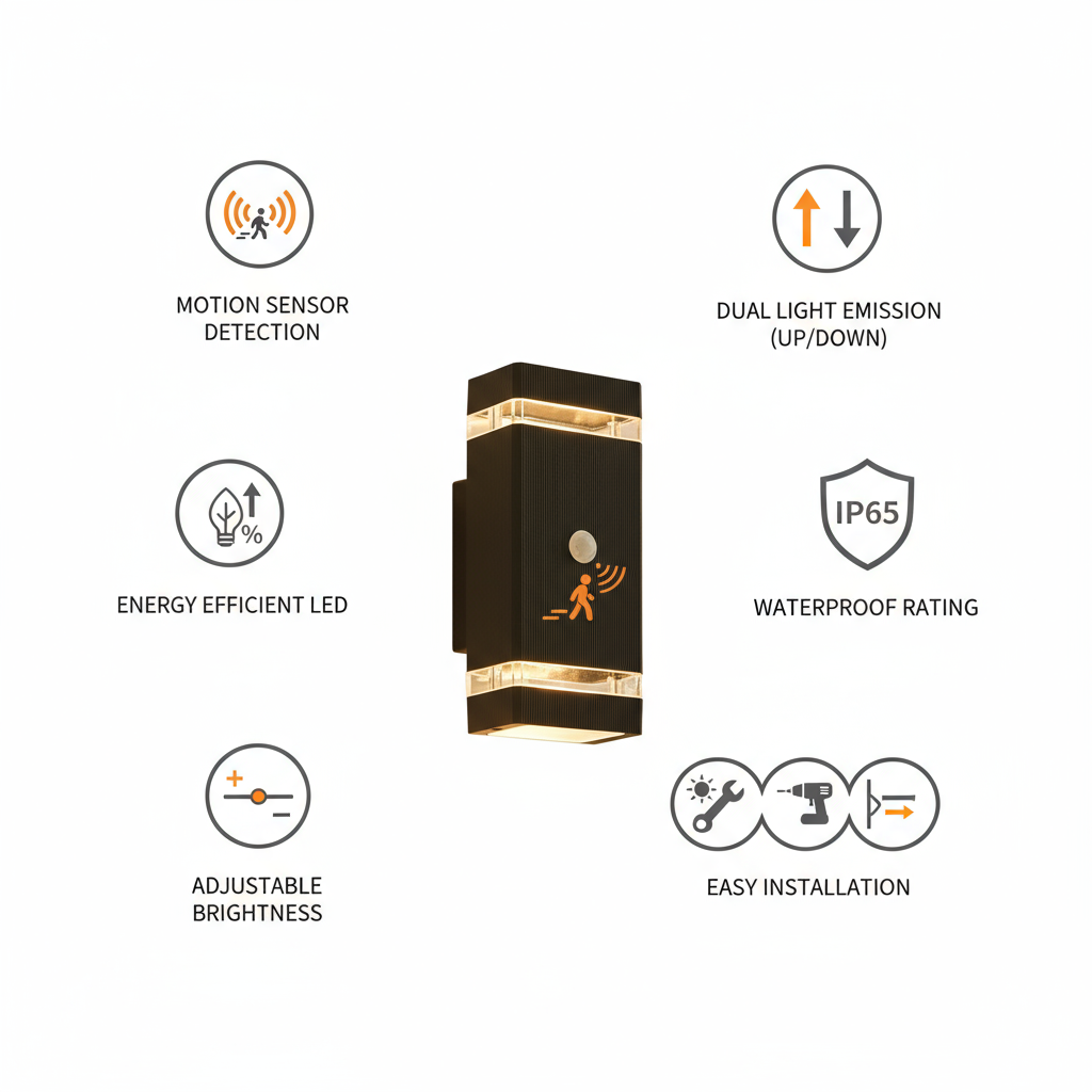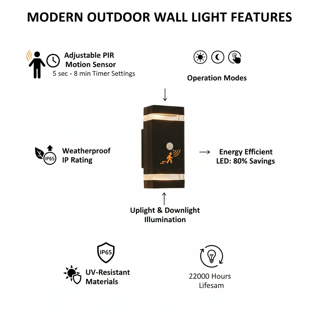 lluminate your home exterior with the LMP Up Down Outdoor Wall Light featuring an advanced PIR motion sensor. Designed with European elegance, this modern black wall sconce provides both uplight and downlight for striking visual impact and improved nighttime security. Its adjustable PIR sensor allows you to customize lighting duration, sensitivity, and mode, giving you full control over your outdoor illumination. Constructed with durable powder-coated aluminum and UV-resistant acrylic, this IP65-rated outdoor light withstands harsh weather, ensuring long-lasting performance. Fitted with two energy-efficient 3000K GU10 LED bulbs, this fixture delivers bright, warm light while reducing energy consumption by up to 80%. Perfect for porches, front doors, gardens, and patios, this modern outdoor lighting solution effortlessly combines style, functionality, and energy efficiency.