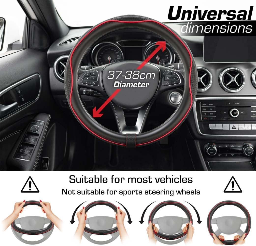Our Upgrade4cars Red Black Leather Look Steering Wheel Cover enhances your driving comfort and vehicle interior style with a premium faux leather finish. Designed for universal fit between 14.5 and 15 inches, this cover combines durability, breathability, and non-slip grip for a secure hold. Its odorless, water-resistant, and easy-to-install design makes it a reliable and stylish upgrade for daily driving, protecting your steering wheel from wear and tear while giving your car a refined appearance.