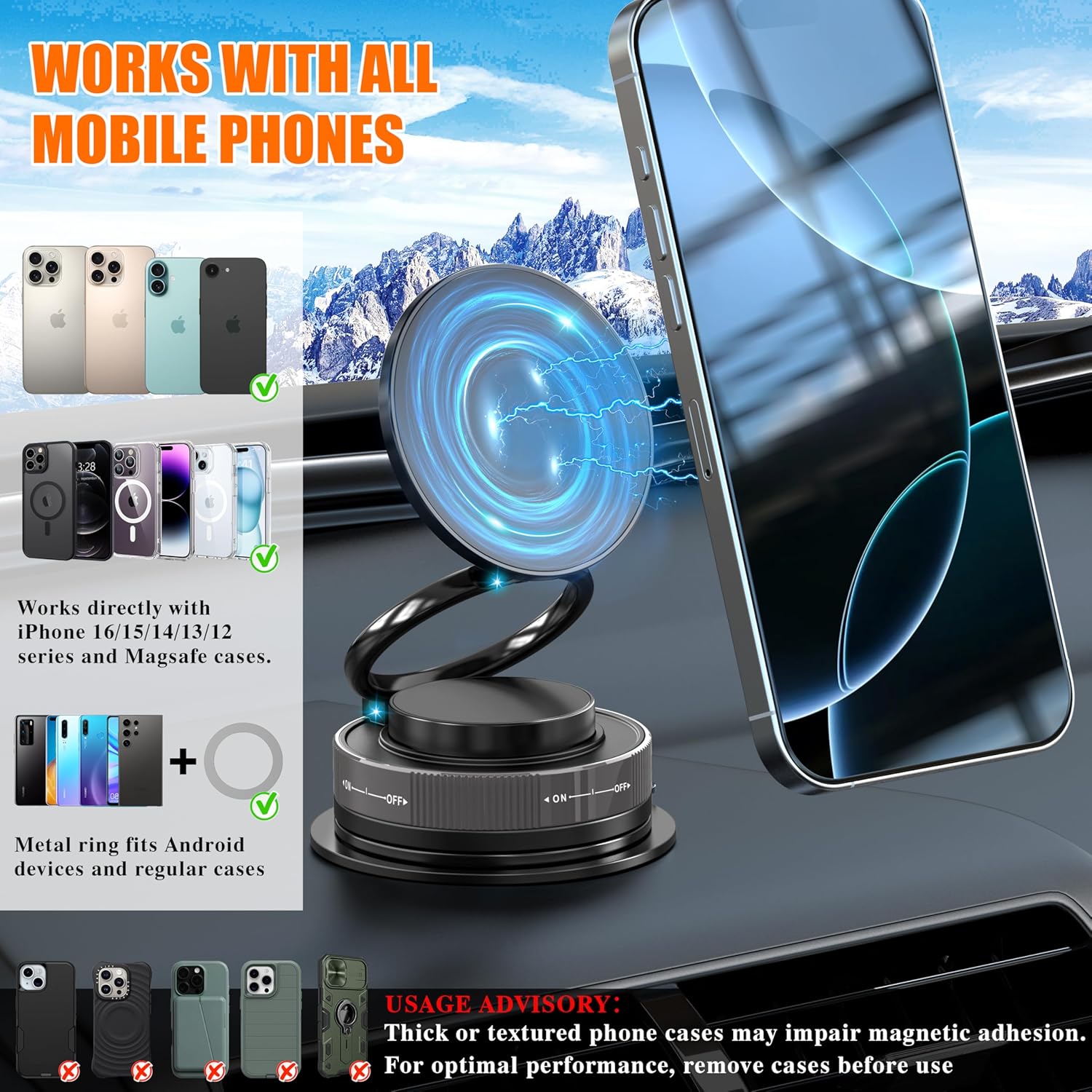Experience ultimate convenience and safety with our Vacuum Magnetic Phone Holder, designed for sturdy and durable performance. Featuring an ultra-stable suction base, this mount can hold your phone securely on any smooth surface, resisting slips and wobbling even on bumpy roads. Equipped with military-grade N55 magnets, it guarantees strong magnetic attachment to dashboards, windscreens, and desktops.