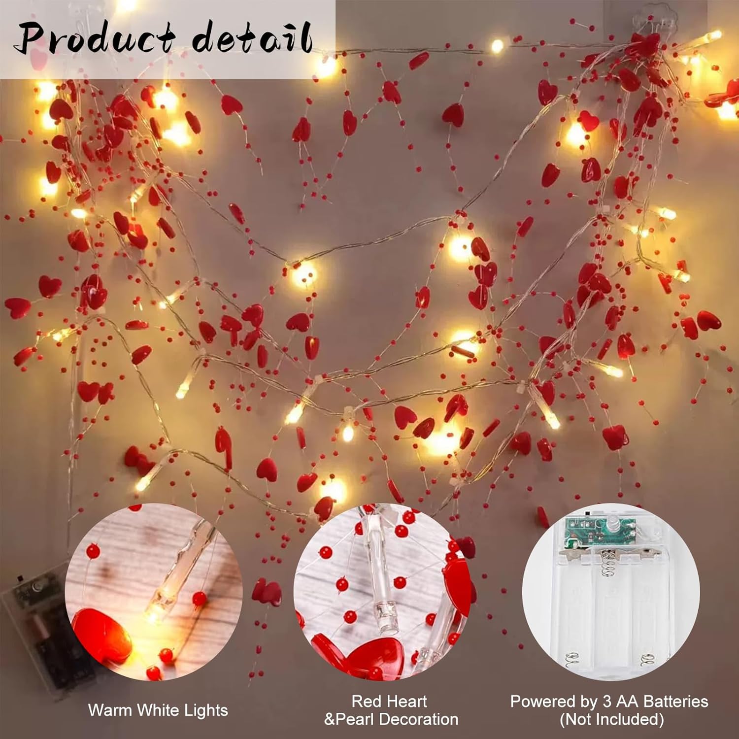 Decorative heart-shaped fairy string lights with red LED glow