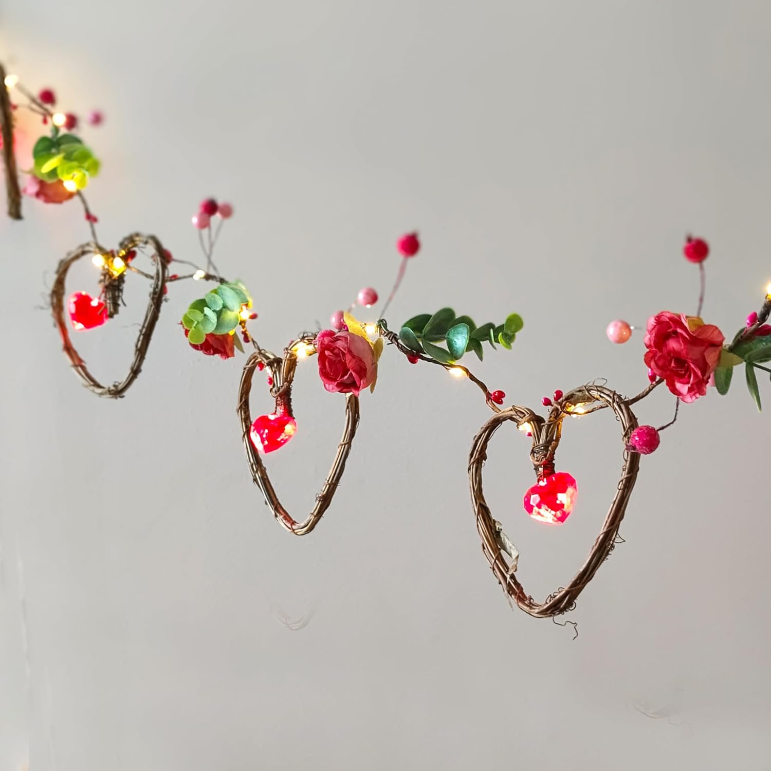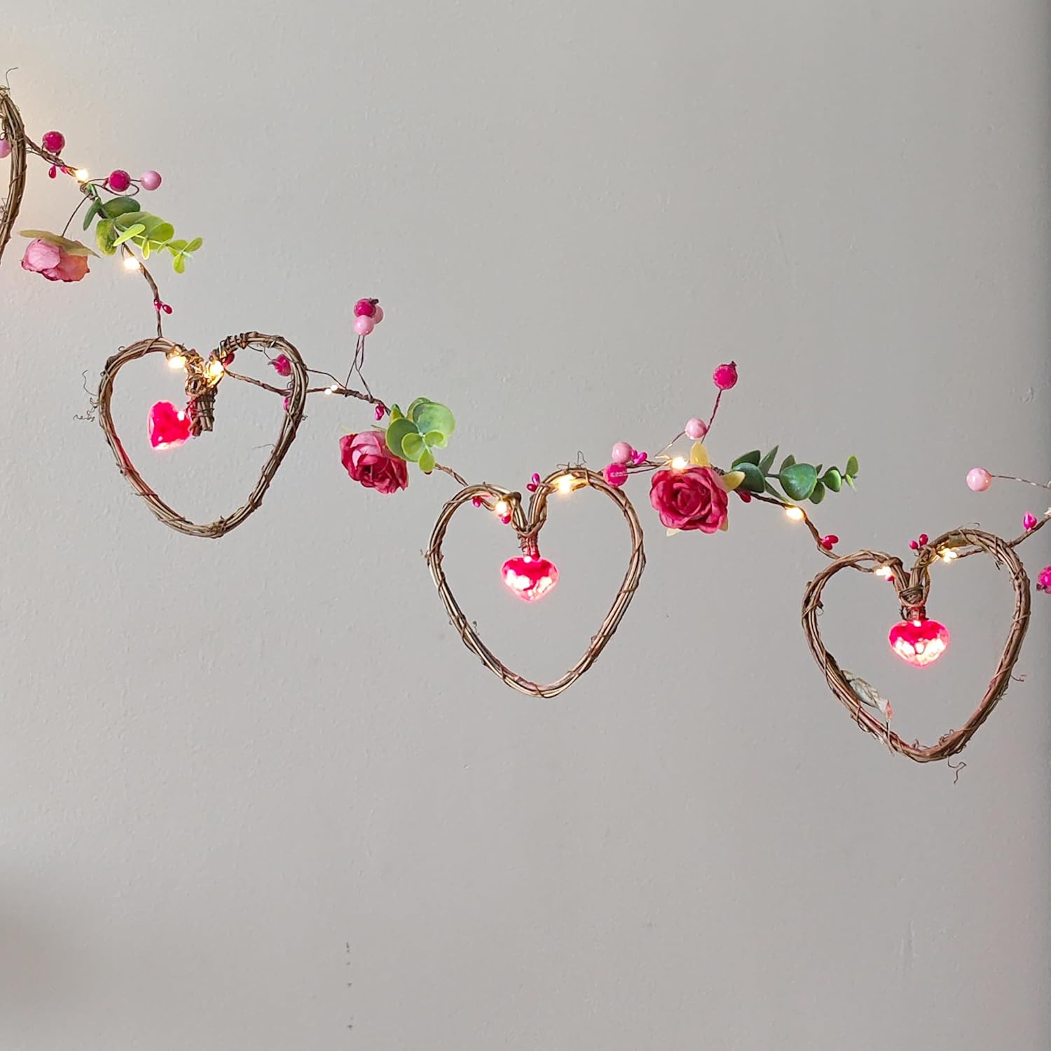 Create a warm and romantic atmosphere with these Valentine’s Day rattan heart garland string lights, thoughtfully designed to enhance indoor décor with natural elegance. Measuring 6.5 feet in length and featuring 25 LED lights, this decorative garland is accented with natural rattan hearts, artificial roses, and acrylic heart details to bring a soft, charming glow to your Valentine’s Day celebrations.
