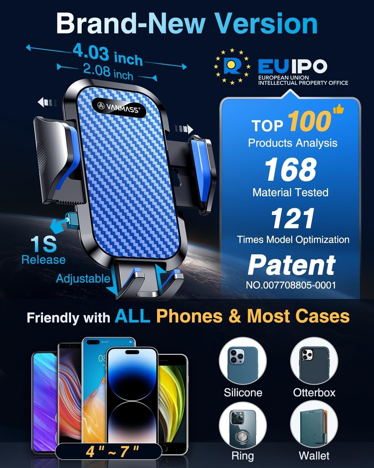 Experience ultimate stability and convenience with the VANMASS Blue Car Phone Holder, engineered for drivers who demand premium quality, reliability, and versatility. Designed with military-grade shockproof certification and EU patented technology, this rotatable mobile phone mount ensures your device stays secure on any road surface. The upgraded 69mm suction cup delivers 40% stronger grip, holding even the heaviest phones safely, while the smooth one-click release allows effortless handling. Crafted from PC+ABS materials with UV and temperature resistance from -40℃ to 90℃, it guarantees long-lasting performance. Flexible 360° rotation, telescopic arm extension, and adjustable air vent clip make it perfect for dashboards, windscreens, and vents. Compatible with all smartphones from 4 to 7 inches, including iPhone, Samsung, Google Pixel, Xiaomi, Huawei, OnePlus, and more, this holder is your ultimate driving companion.