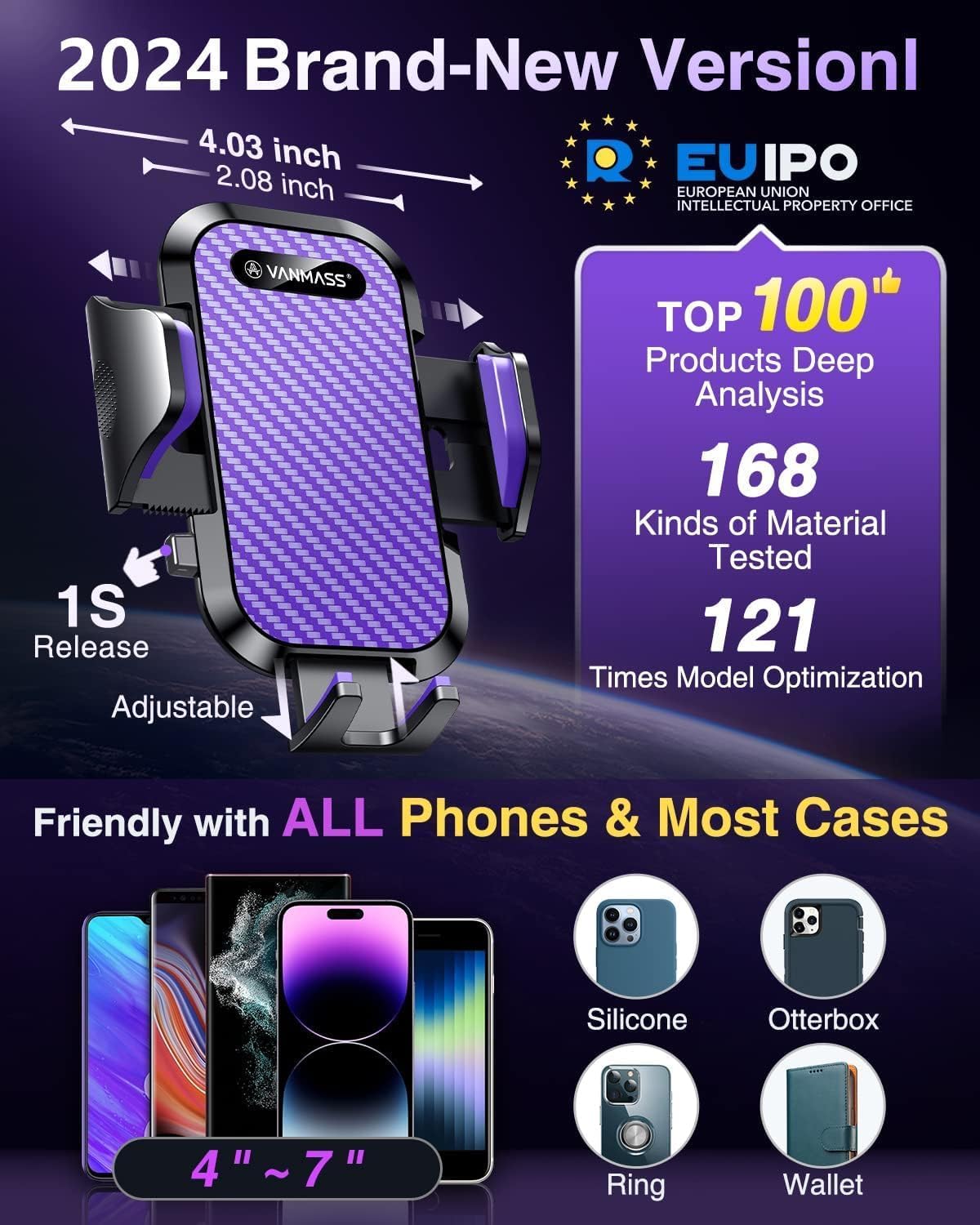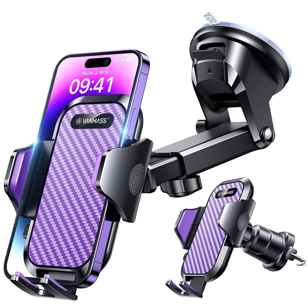 Experience the ultimate car phone holder with the VANMASS Purple Upgraded Suction & Clip. Designed for iPhone 15 Pro Max, 14, 13, 12, and more, this rotatable universal mobile phone mount ensures unmatched stability and convenience for drivers. Built to military-grade standards, it offers shockproof durability, UV resistance, and temperature tolerance from -40℃ to 90℃, making it a reliable dashboard, windscreen, or vent cradle for any vehicle. The larger 69mm suction cup guarantees a strong hold for phones of all sizes, while the one-click release function allows easy removal with just one hand. Enjoy 360° rotation and flexible angle adjustment to position your device at the perfect viewing angle. Compatible with phones 4–7 inches and thick cases, this mount is the ultimate van, car, and automobile accessory for safe, hands-free driving.