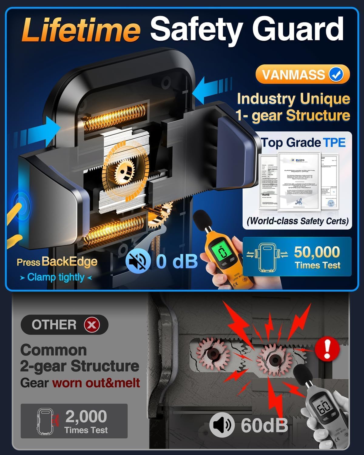 Our VANMASS Military-Grade Car Phone Holder Mount delivers unmatched stability, strength, and safety for your mobile device on the road. Designed with true military-grade materials and certified by international standards, it offers exceptional suction power, vibration resistance, and durability even under extreme temperatures. This car mount combines a patented 65LBS suction cup with a steel-cored vent clip, ensuring your smartphone remains secure on dashboards, windscreens, or vents without leaving marks. Engineered for performance and reliability, it’s ideal for iPhone and Samsung users seeking a long-lasting, secure mounting solution.