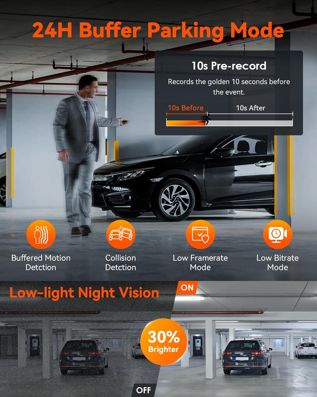- 10-second pre-record buffered parking mode for 24/7 monitoring
