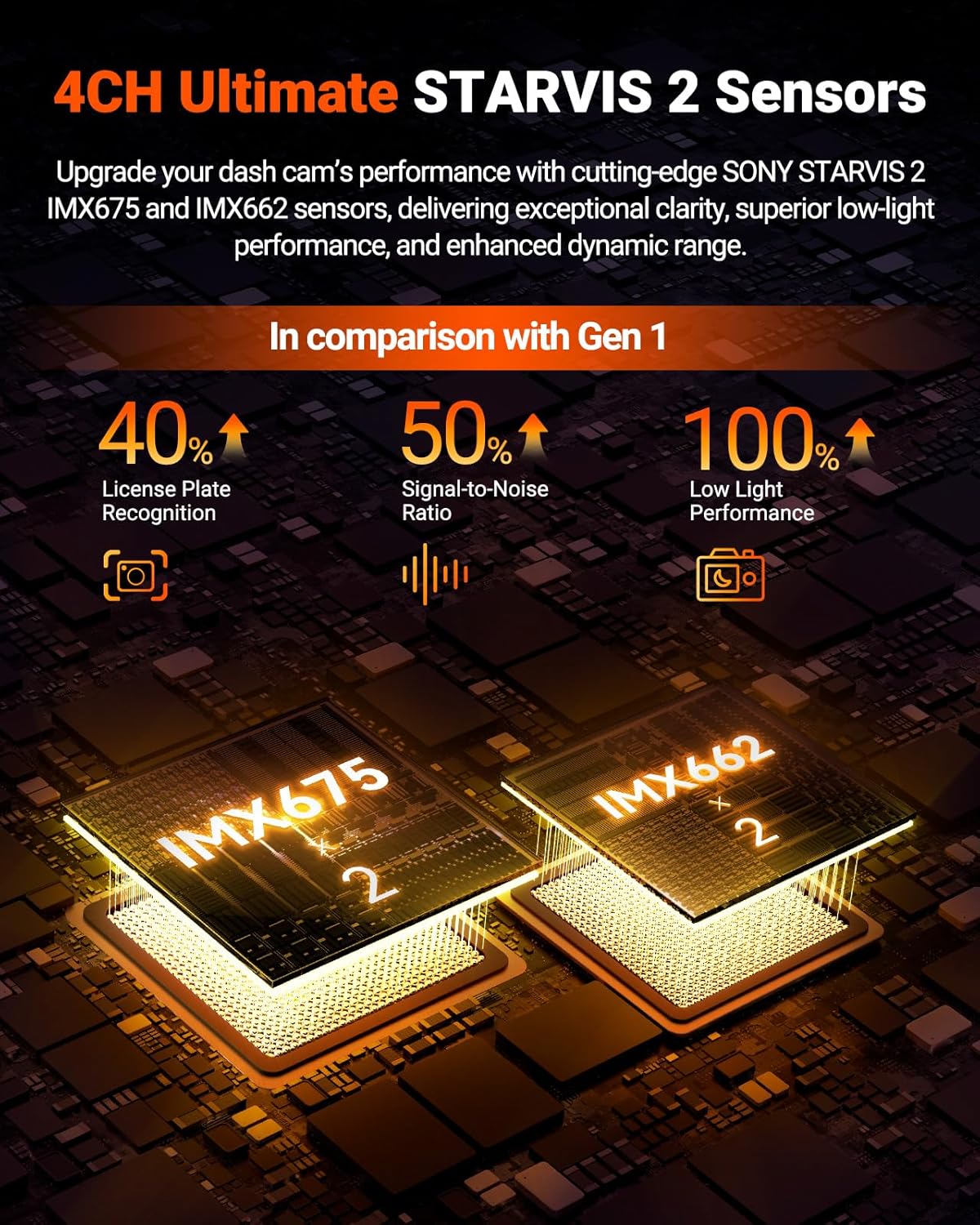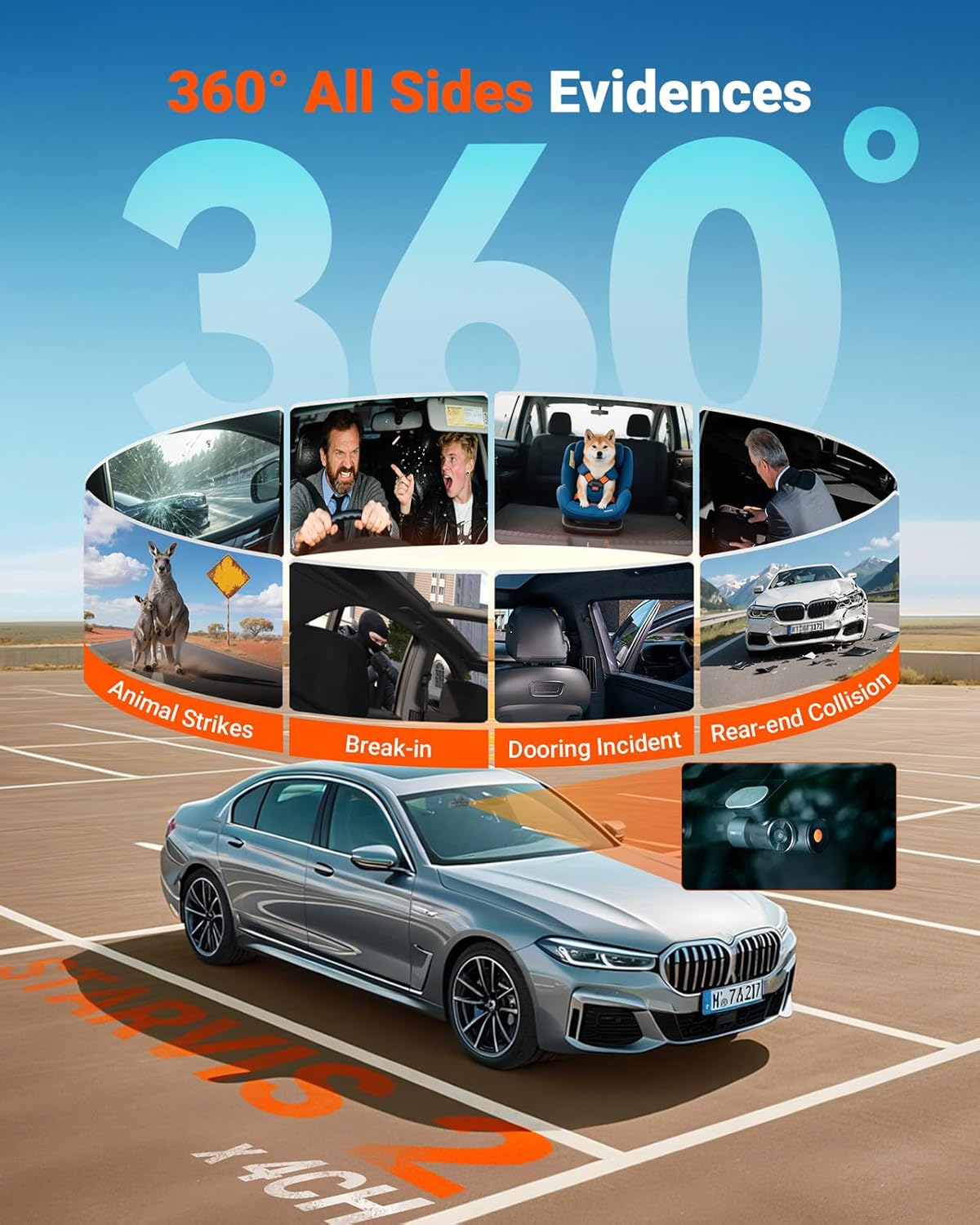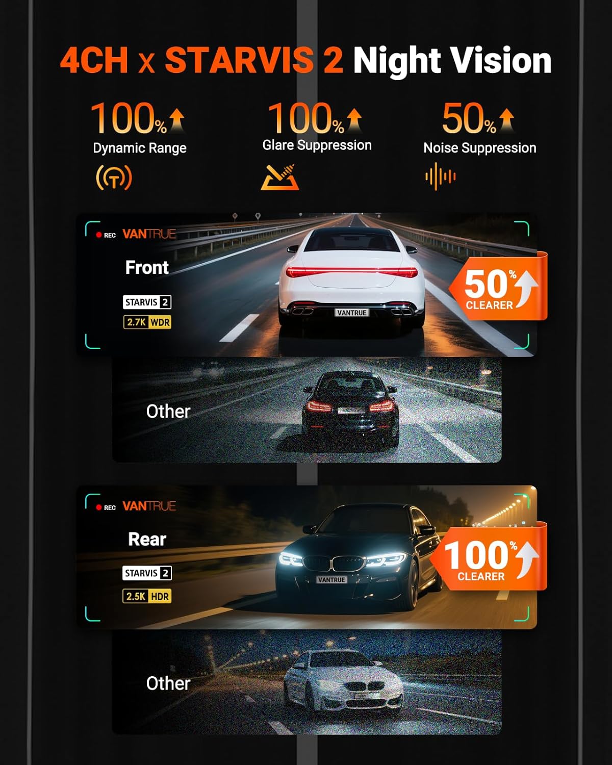 The Vantrue N5S 4-Channel Dash Cam redefines in-car security with unparalleled 360° coverage and ultra-clear video capture. Featuring advanced STARVIS 2 sensors and IR night vision, this dashcam ensures crisp footage both day and night. Record in stunning 2.7K+1080P*2+2.5K resolution across all lenses, capturing every detail of the road, passengers, and cargo. The dual-core CPU delivers smooth, continuous recording without lag, while the adjustable 160° lenses provide comprehensive coverage of your vehicle’s surroundings. With parking mode that records 10 seconds pre-event and 30 seconds during an incident, your car is protected even when unattended. Effortlessly control the camera via the Vantrue app, voice commands, or built-in buttons. Elegant 3.19-inch IPS display and durable construction with high-temperature protection make this dashcam a reliable companion for all driving conditions. Compatible with a wide range of accessories and supporting up to 1TB storage, the N5S ensures you never miss a moment.