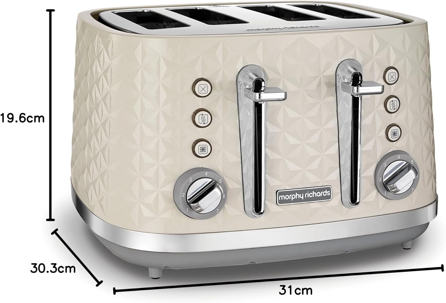 Our Morphy Richards Vector 4 Slice Toaster (1800W) combines bold design with everyday practicality. Featuring a high gloss geometric pattern in cream, this toaster adds a modern touch to any kitchen. With variable width slots, it accommodates everything from thick artisan bread to slim slices, ensuring even toasting every time. The defrost and reheat functions provide added versatility, while the removable crumb tray makes cleaning quick and easy. Perfect for busy mornings, the Vector toaster offers both style and performance in one sleek appliance.