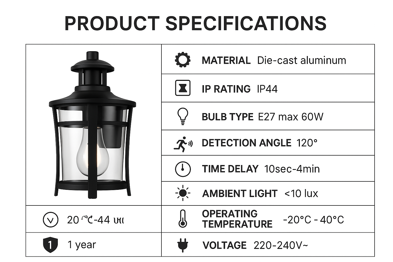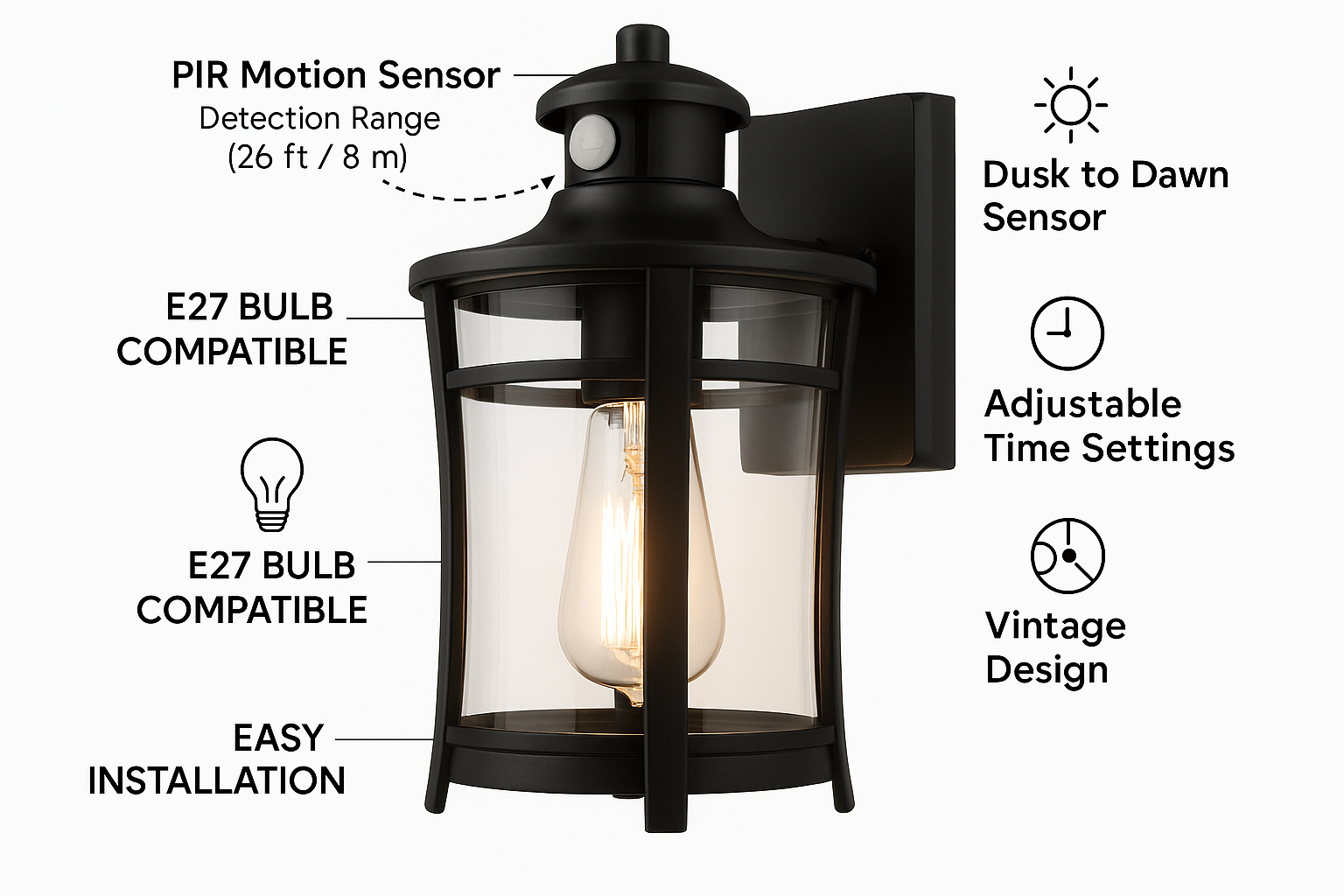 Our Vintage PIR Motion Sensor Wall Lantern combines classic design with modern security features, offering a timeless lighting solution for porches, entryways, and gardens. Built from weather-resistant materials with an elegant black finish, this lantern includes a built-in motion sensor for added convenience and safety. Perfect for enhancing your home’s curb appeal while automatically lighting the way when motion is detected.
