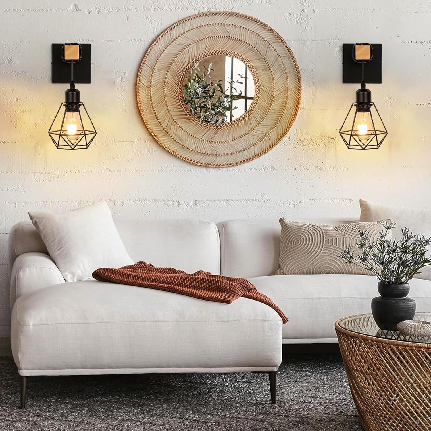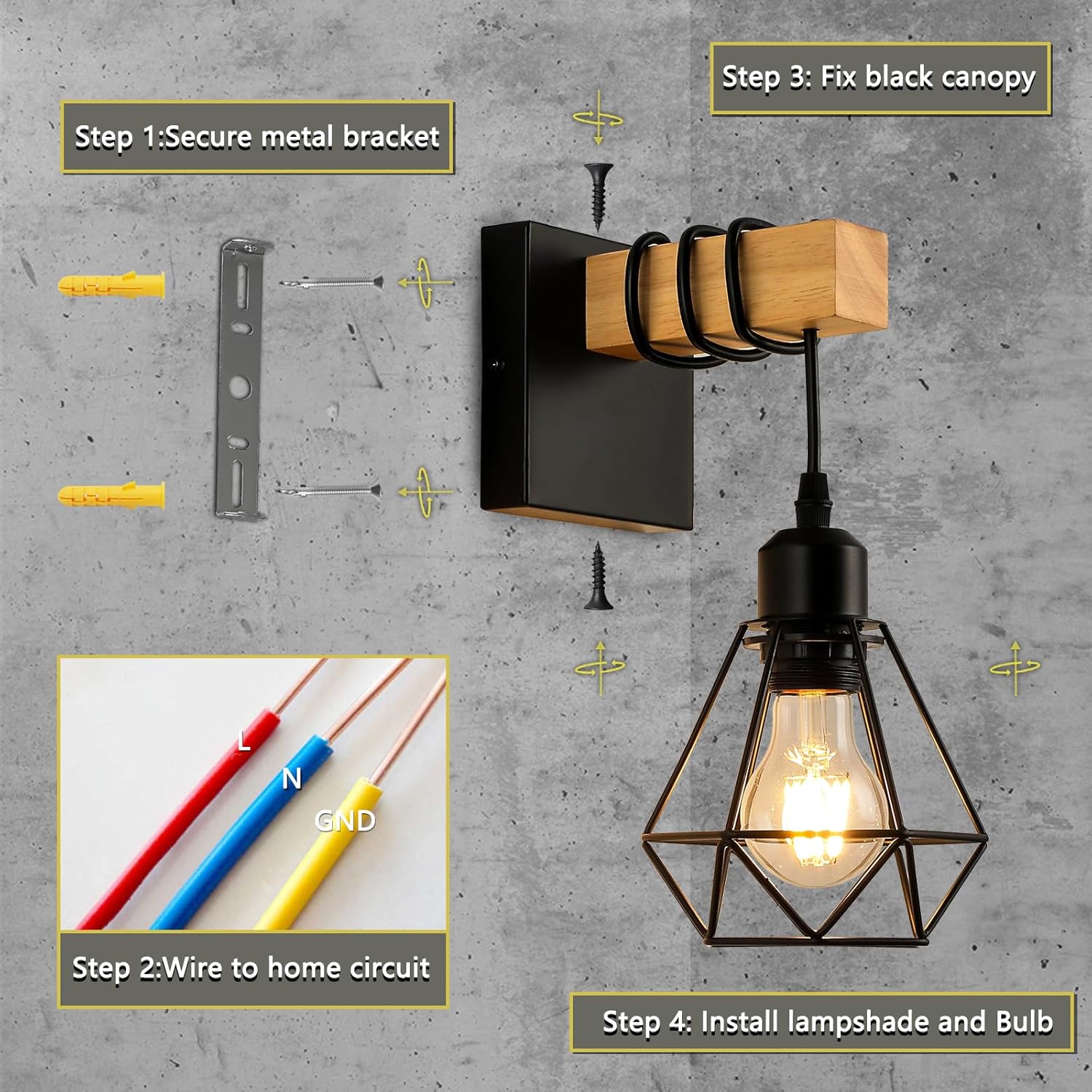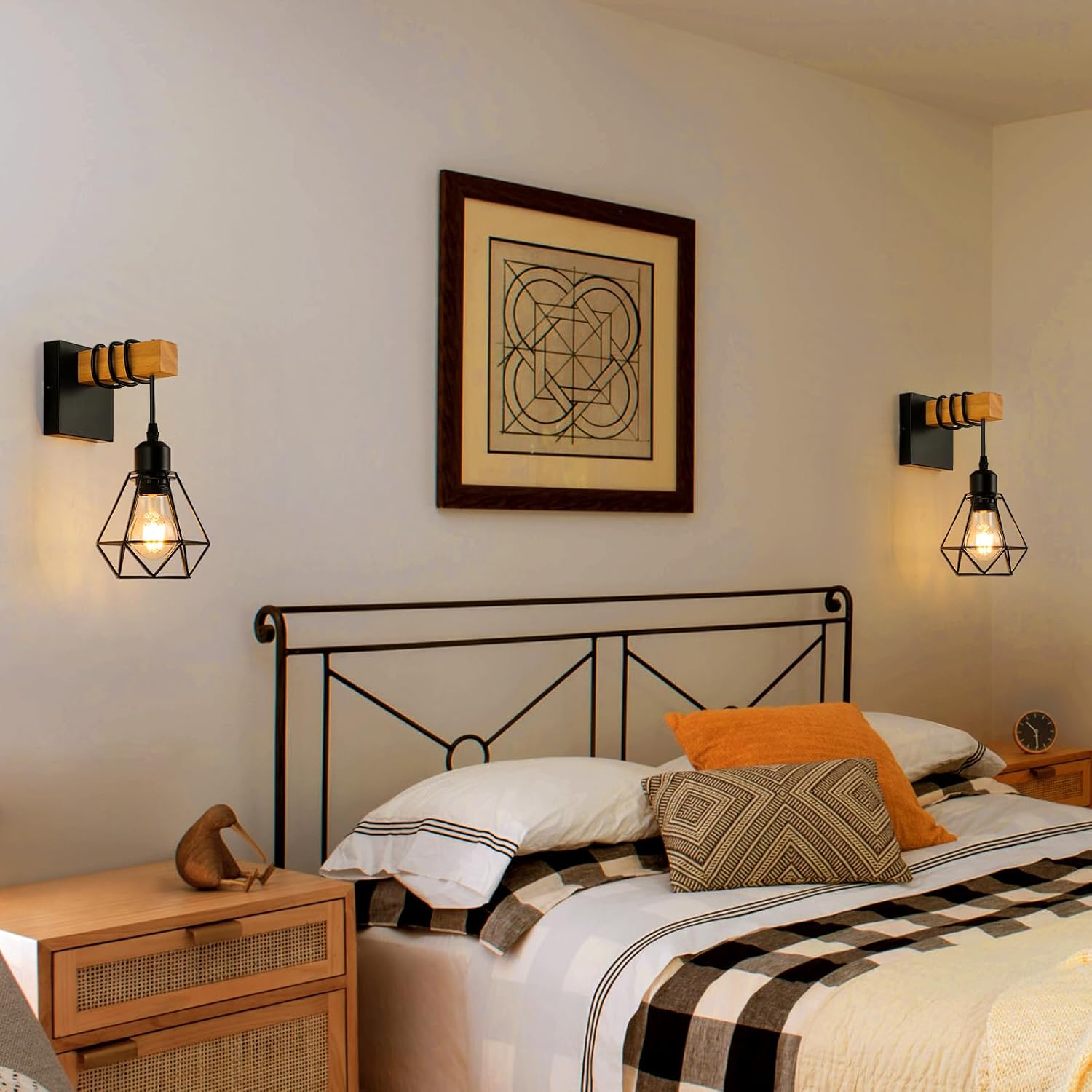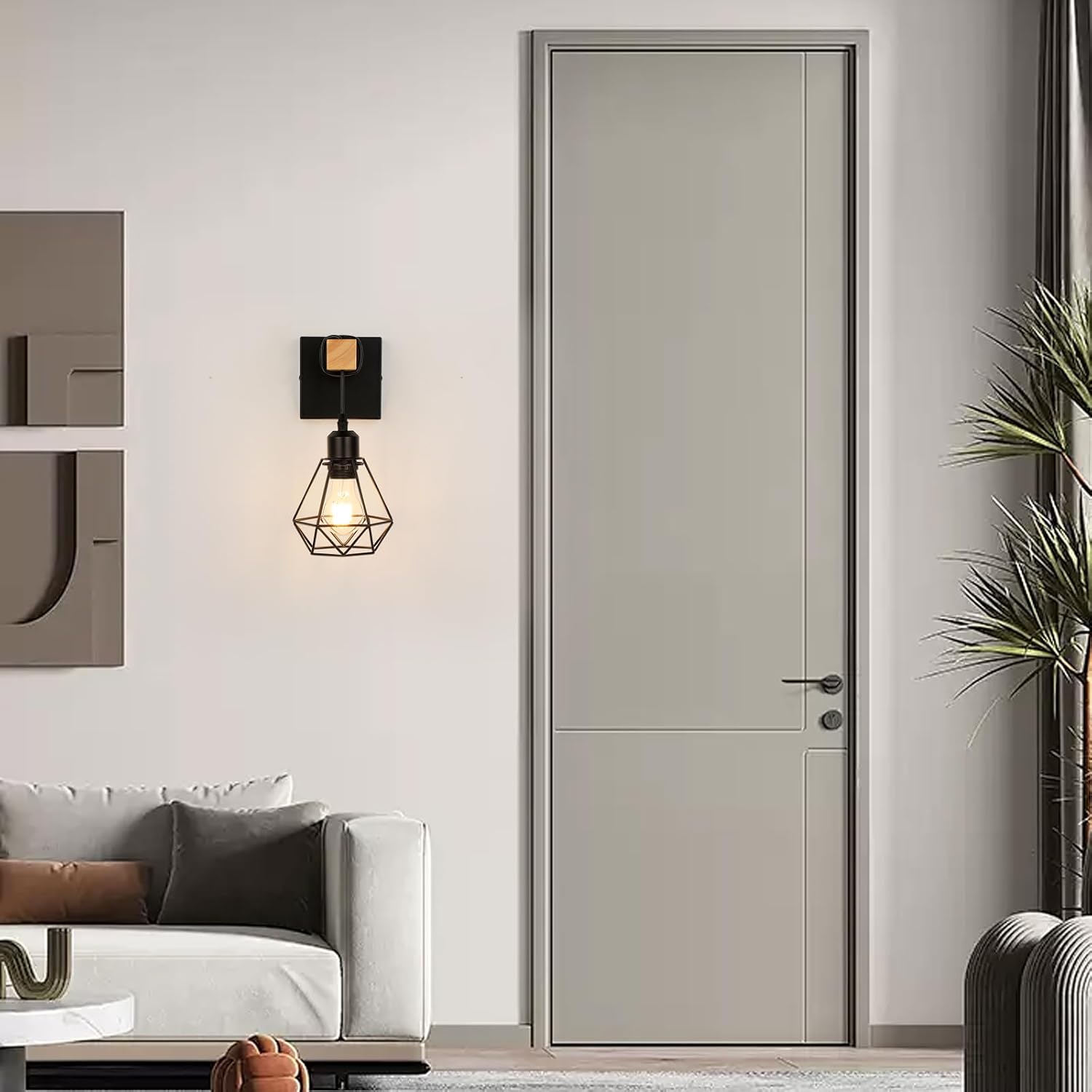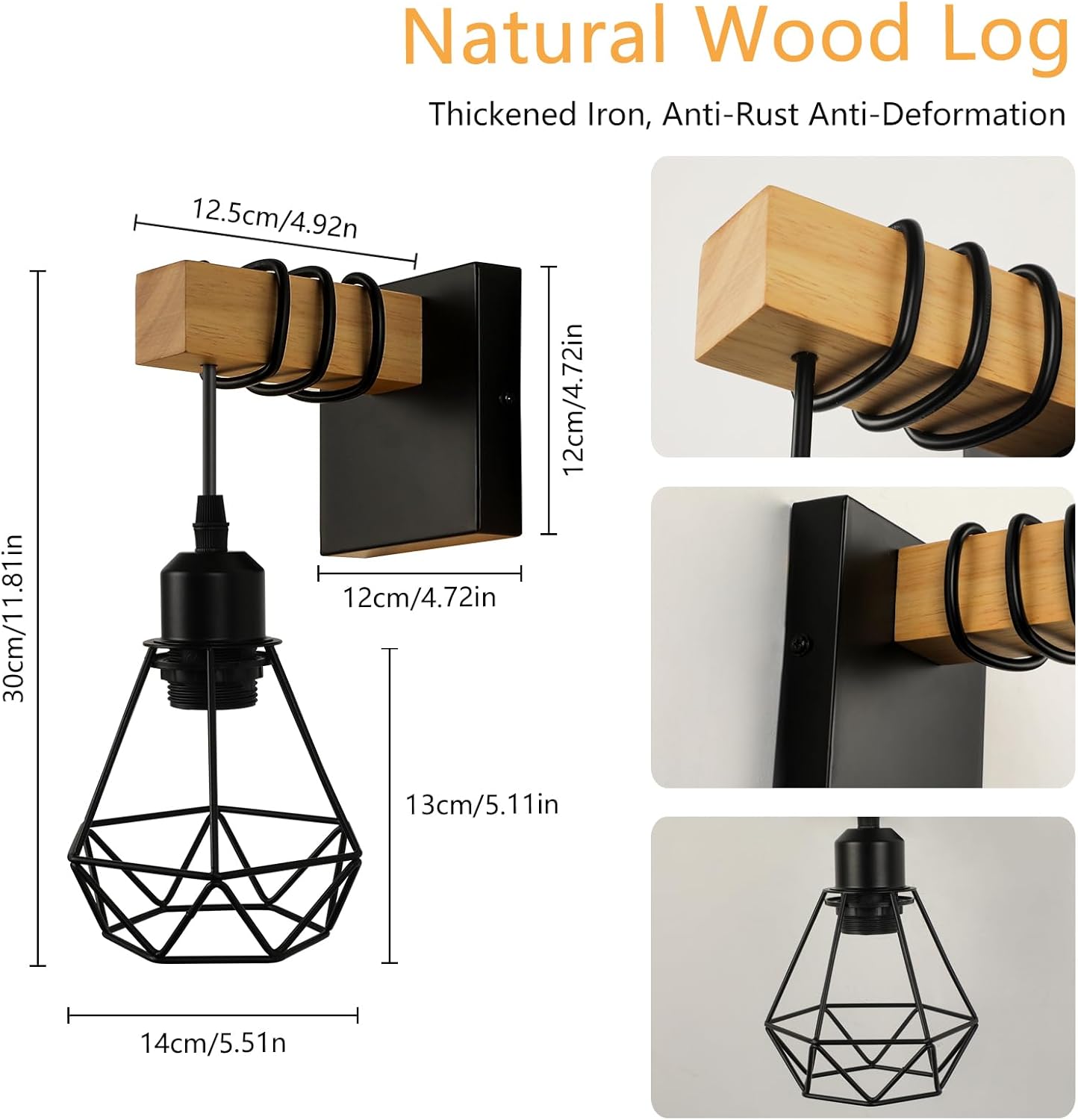 Our vintage wood industrial wall light combines a diamond wire cage metal shade with a natural wooden arm to create a distinctive rustic and industrial lighting solution for indoor spaces. Designed for wall mounting, this E27 wall sconce supports bulbs up to 60W and delivers strong illumination while creating an eye-catching play of light and shadow, making it suitable for living rooms, bedrooms, hallways, staircases, and other interior settings.