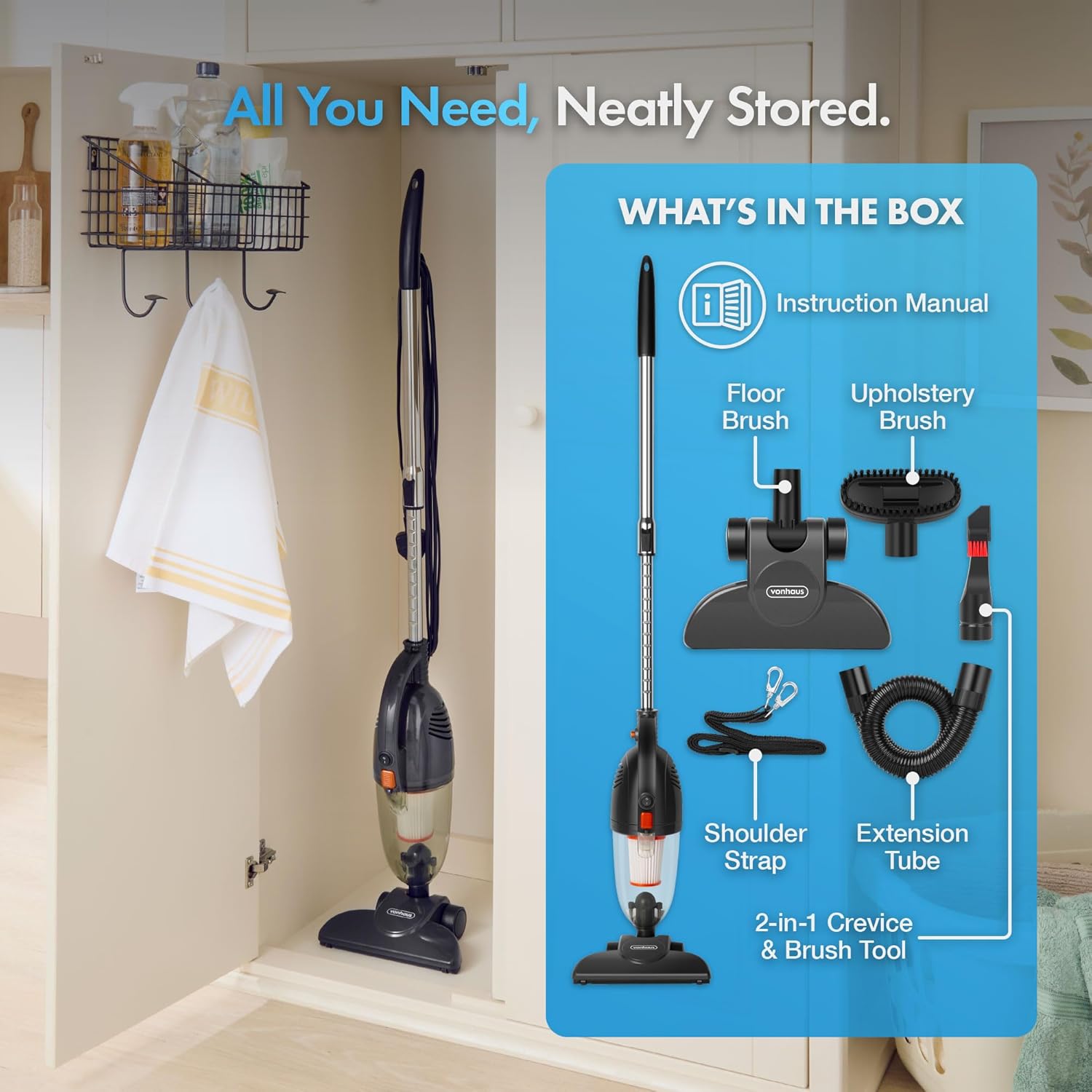 The VonHaus 2-in-1 Stick Vacuum Cleaner delivers 800W power with 17000Pa strong suction for unbeatable cleaning performance. Designed for versatility, this lightweight upright & handheld vacuum easily switches between modes to handle every cleaning task — from carpets to hard floors, stairs, and furniture.