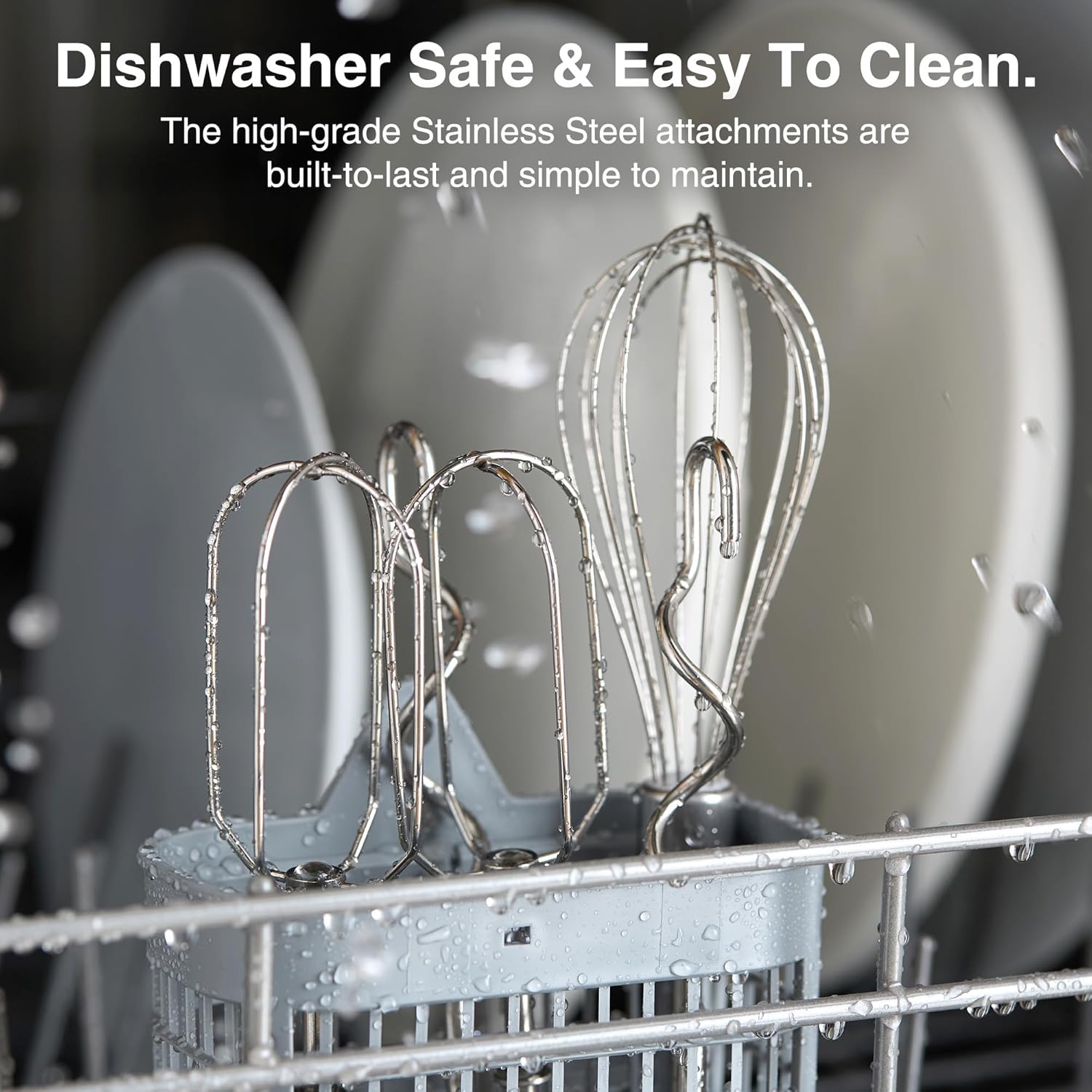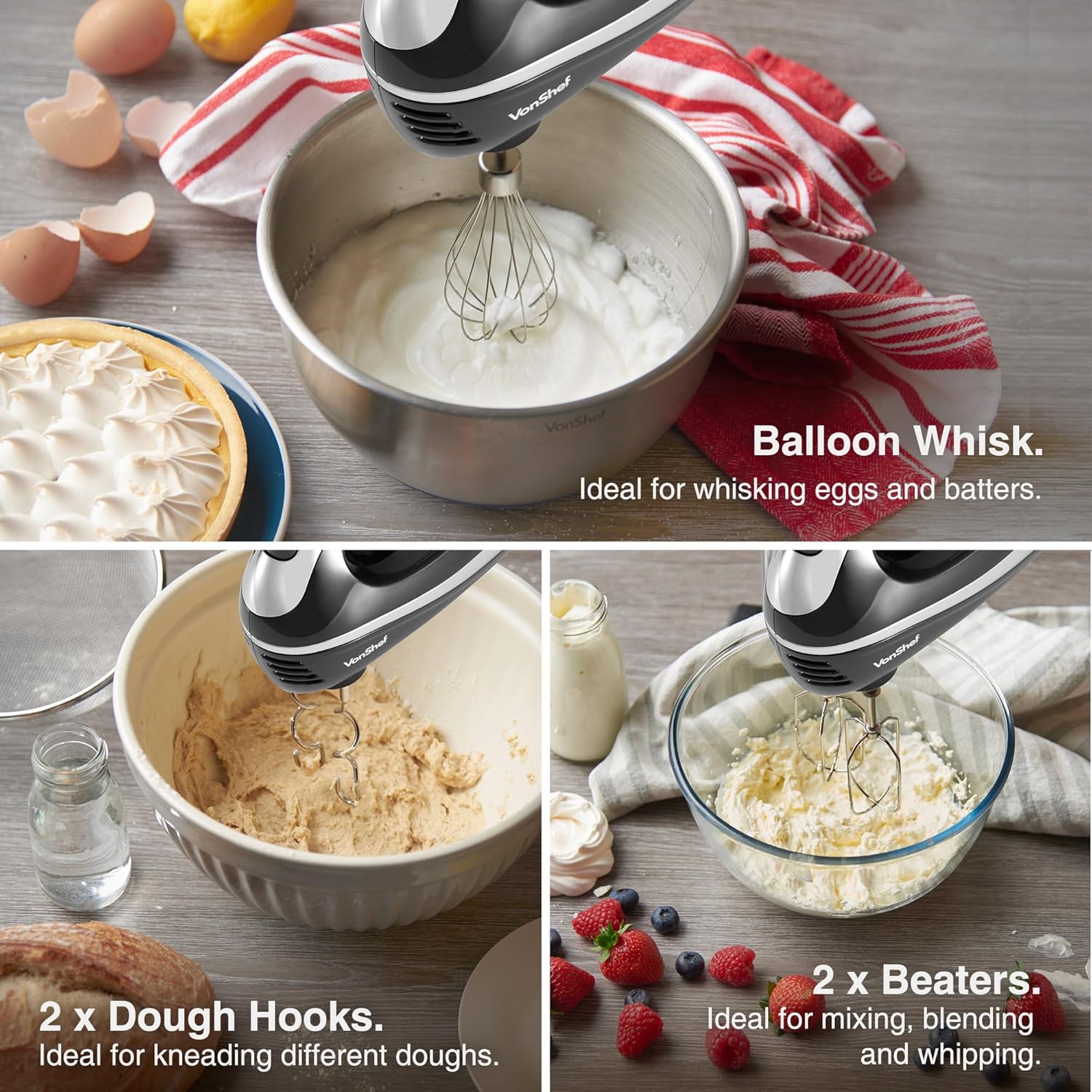Includes 2 beaters, 2 dough hooks, and a balloon whisk for versatility