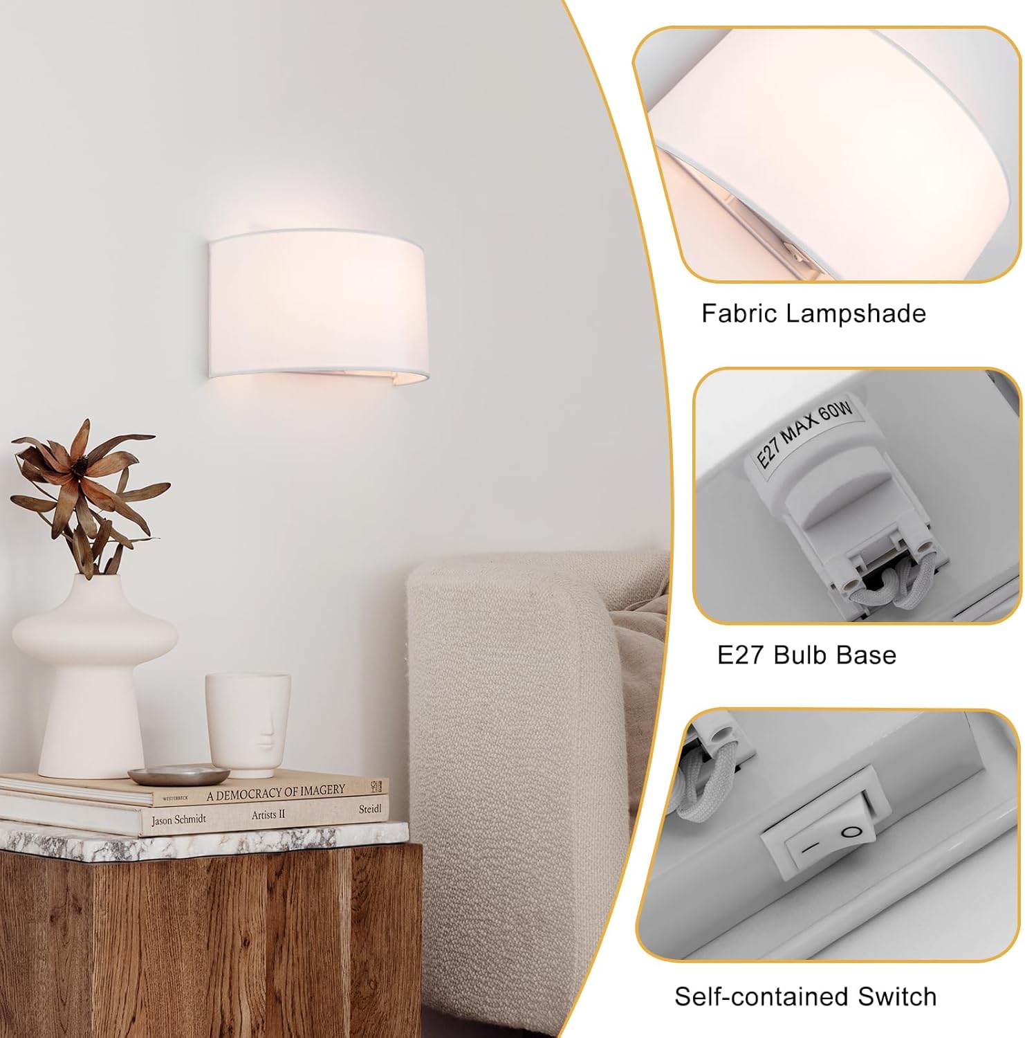 Our wall light with switch is designed to provide soft wall wash illumination and focused reading light for comfortable indoor use. Featuring a white semi-circle fabric shade and an E27 ES lamp holder, this bedside wall sconce delivers gentle, diffused lighting ideal for bedrooms, living rooms, hallways, kitchens, and hotel interiors. The compact wall-mounted design with integrated switch makes it a practical and space-saving lighting solution, offering both functional performance and a clean, timeless appearance.