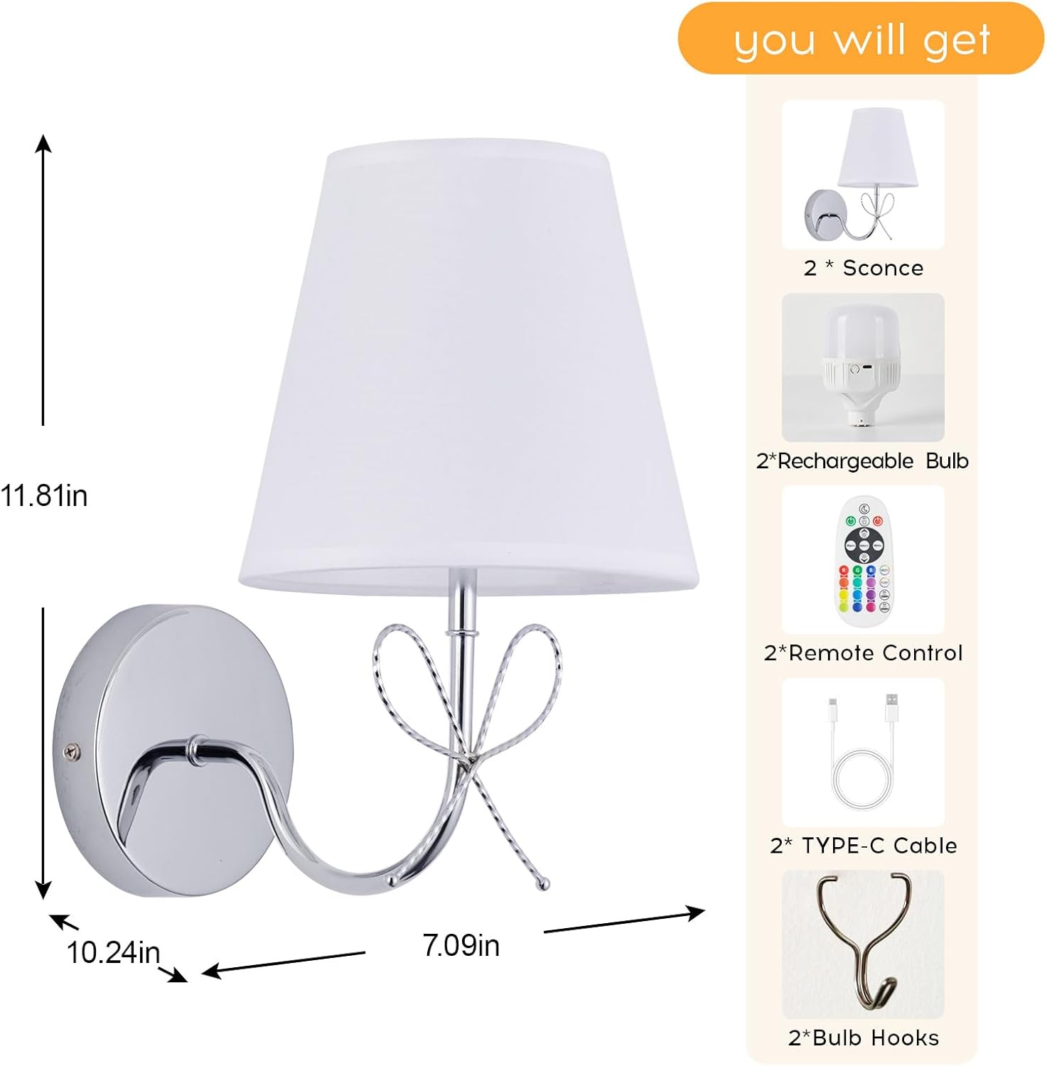 Our wireless battery operated wall lights set of two is designed to provide flexible, cordless indoor lighting for bedrooms and living rooms, combining modern convenience with elegant chrome styling. Powered by rechargeable 5200mAh LED bulbs delivering 320 lumens, these wall-mounted lights offer adjustable brightness, three colour temperatures, and multiple RGB colour options, all controlled via remote or manual buttons. With timer and memory functions, easy installation, and long-lasting runtime, this rechargeable wall lighting solution delivers both ambient and functional illumination without the need for wiring.